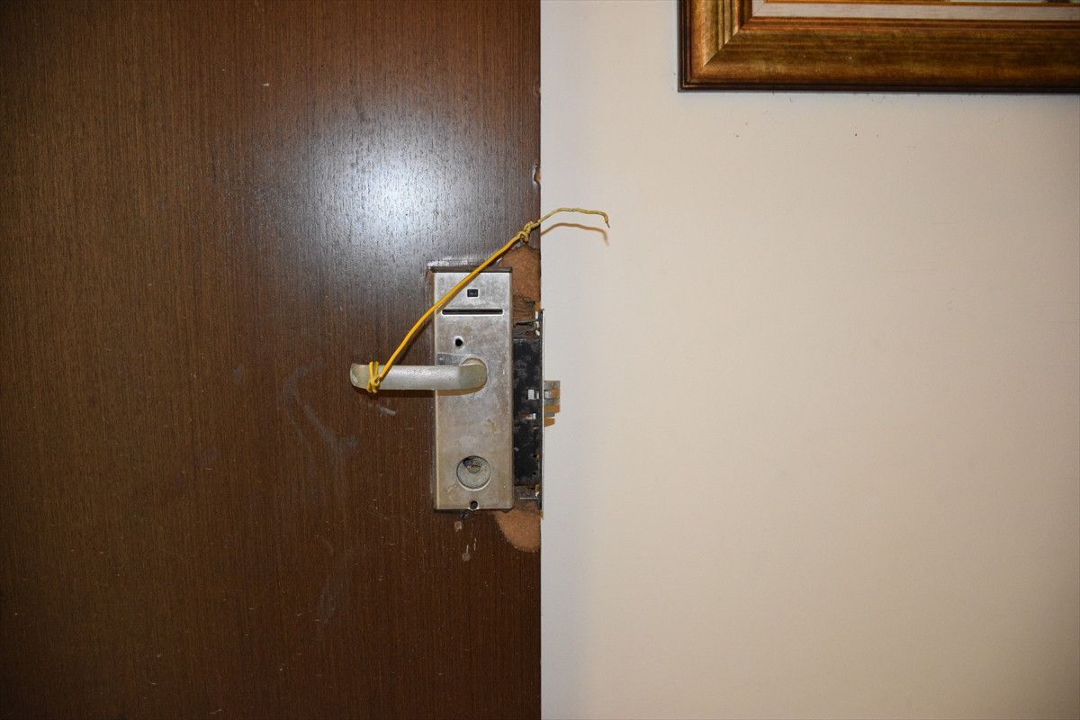 Suikast timinin saldırısı sırasında çatışmanın yaşandığı otel odasında darbecilere karşı koyan bir muhafaza polisine ilişkin kelepçe, kan izleri bulunan yatağın üzerinde dururken bir kanepenin üzerinde 18 kurşun izi dikkatleri çekiyor.