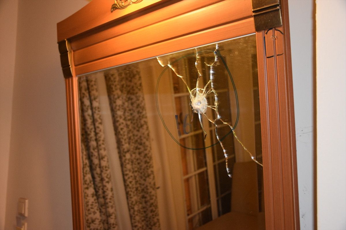 Saldırının en ağır yaşandığı odaların birindeki kırık pencereler ise dış cephenin kartonpiyerle kaplanmasıyla kamufle edilmiş durumda.
