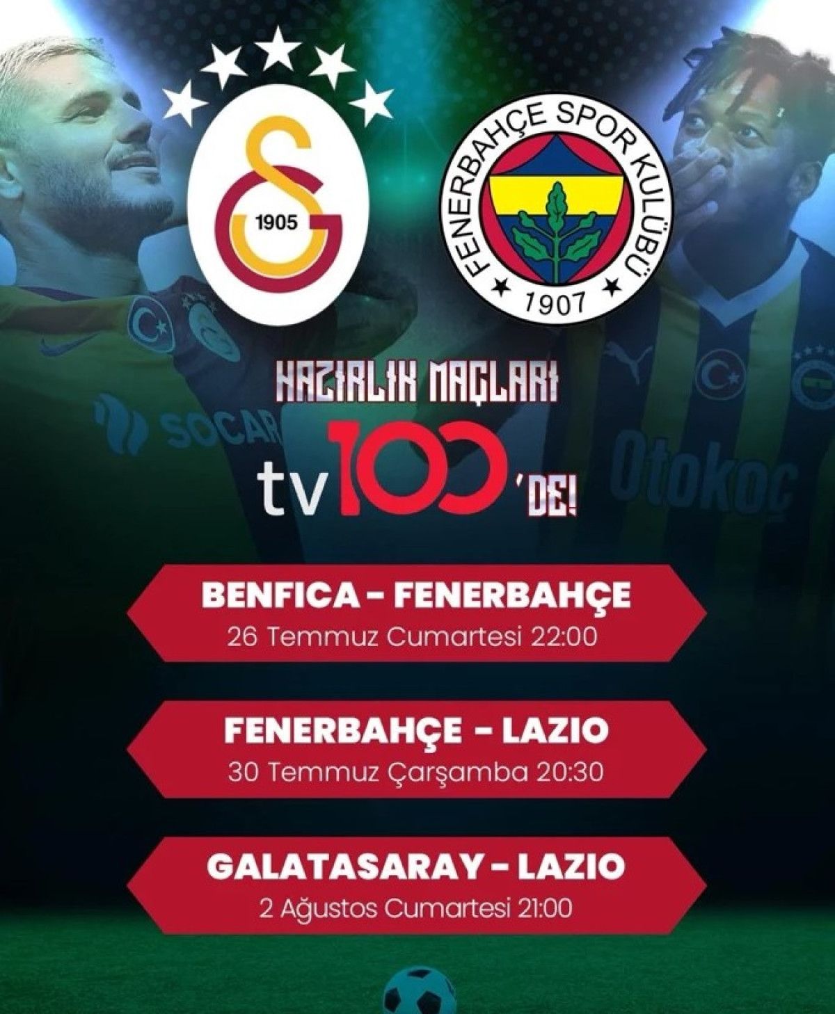 Yeni dönem kapıya dayandı! Fenerbahçe ve Galatasaray’ın hazırlık maçları, tv100 ekranlarında futbolseverlerle buluşuyor. Tarihler not edin: 26 Temmuz Cumartesi, 30 Temmuz Çarşamba ve 2 Ağustos Cumartesi akşamları nefesler tutulacak!