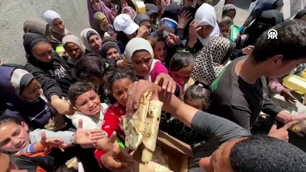 Yardım kuruşluları aracılığıyla dağıtılan yemekleri almak için bölgeye gelen Filistinliler izdiham yarattı.
