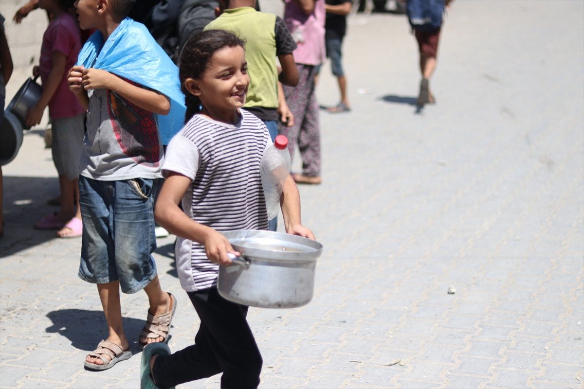 İsrail’in Gazze Şeridi’ne uyguladığı abluka ve devam eden hücumlar nedeniyle besine erişimde zorluk yaşayan Filistinlilere, bir hayır kurumu tarafından yemek dağıtımı yapıldı.