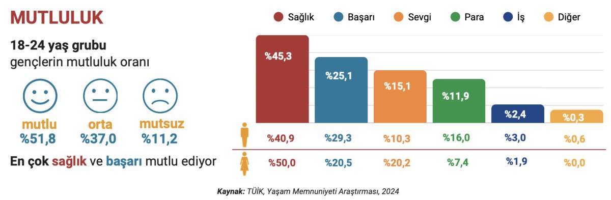 Sevgi (yüzde 15,1), para (yüzde 11,9), iş (yüzde 2,4) ve öbür nedenler (yüzde 0,3) ise daha düşük oranlarda memnunluk kaynağı olarak öne çıkıyor.