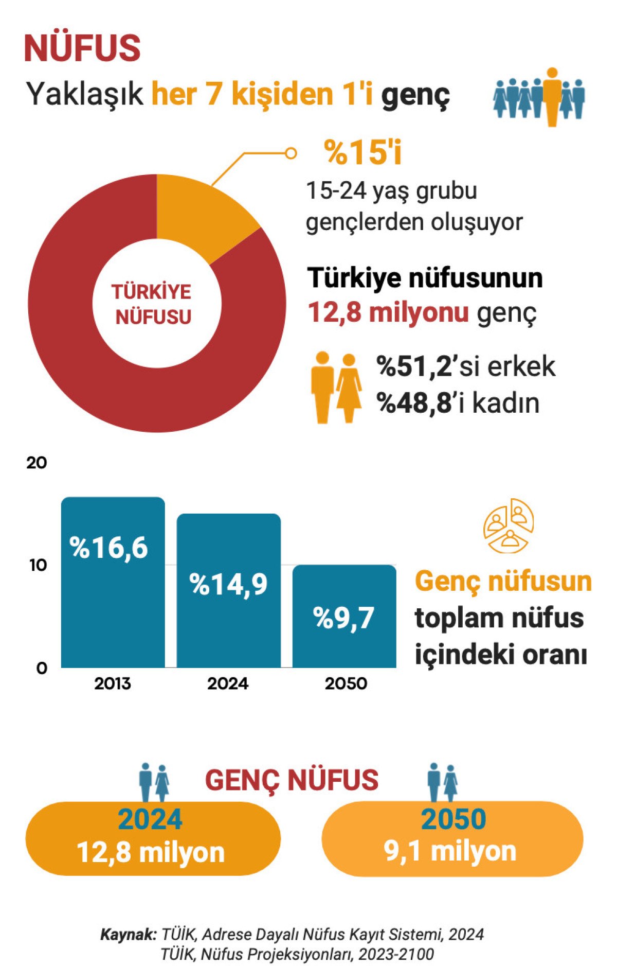 Türkiye İstatistik Kurumu’nun “İstatistiklerle Gençlik 2024” araştırmasına nazaran, nüfusun yüzde 14,9’unu 15-24 yaş kümesindeki genç nüfus oluşturdu.