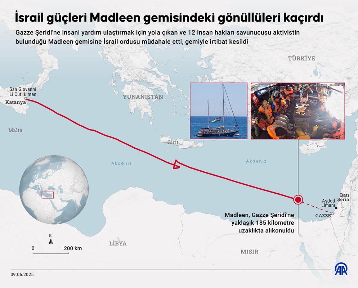 “Özgürlük Filosu Koalisyonu” isimli sivil toplum kuruluşunun Gazze’ye yönelik ablukayı kırıp bölgeye yardım götürme maksadıyla düzenlediği son misyon çerçevesinde 18 metrelik Madleen gemisi, 1 Haziran’da İtalya’nın Katanya kentindeki San Giovanni Li Cuti Limanı’ndan Gazze için yola çıkmıştı.