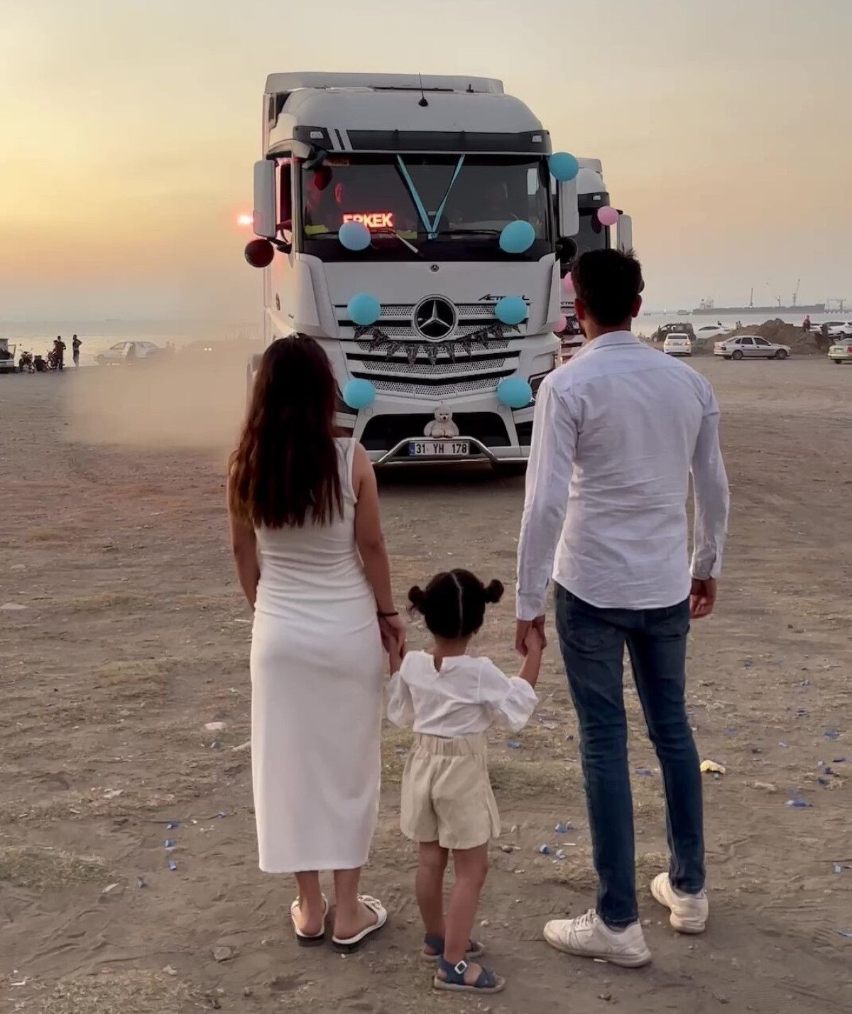 Genç tır sürücüsünün meslektaşları ve Çevik ailesinin hazırladığı tertipte süslenen iki tırdan birine “erkek”, başkasına “kız” yazıldı.