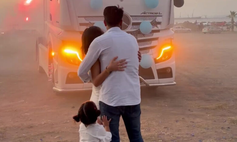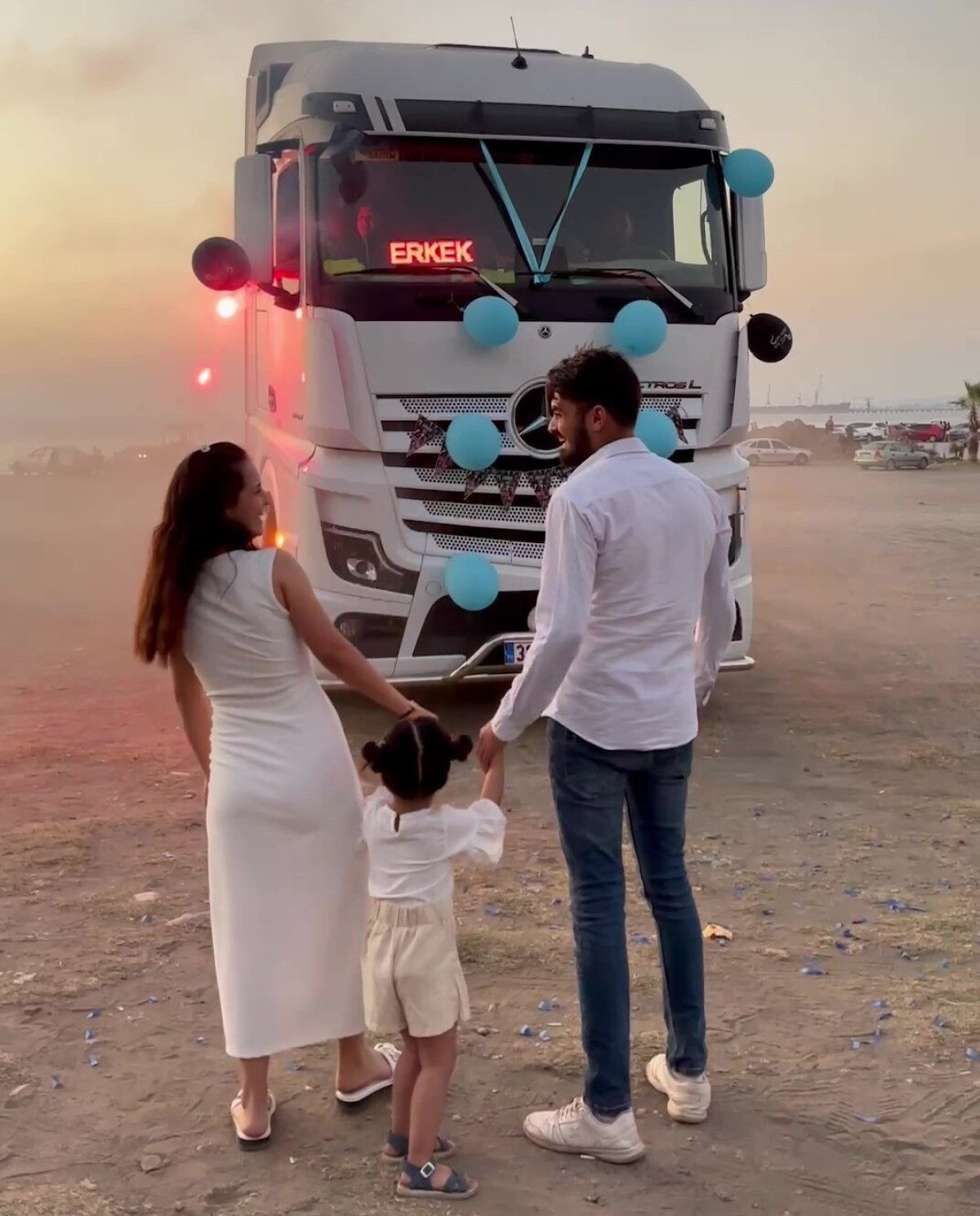 Aynı anda harekete geçen tırlardan “erkek” yazılı olan tır öne geçip korna çalınca genç çift bebeklerinin cinsiyetinin erkek olduğunu öğrendi.