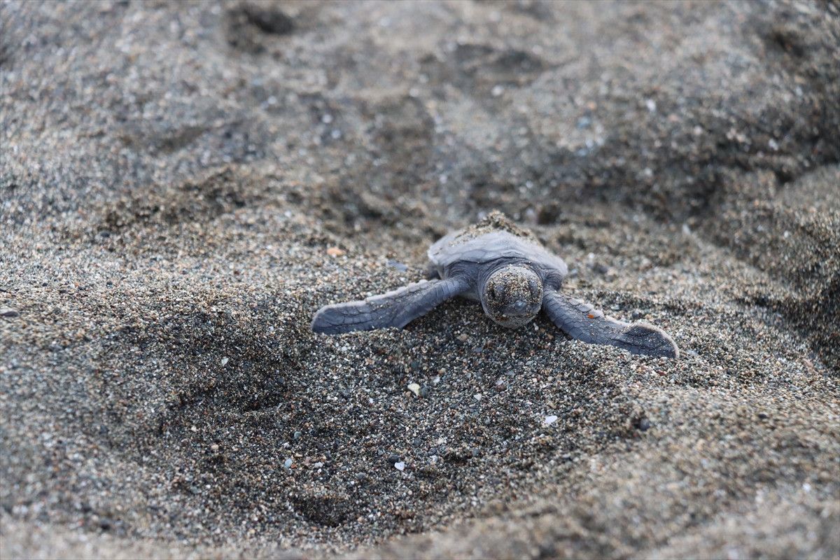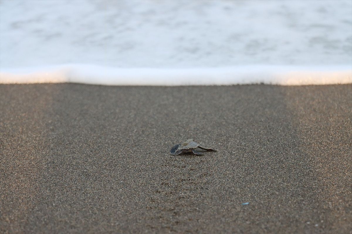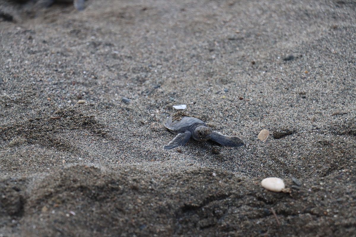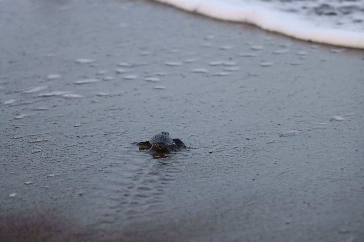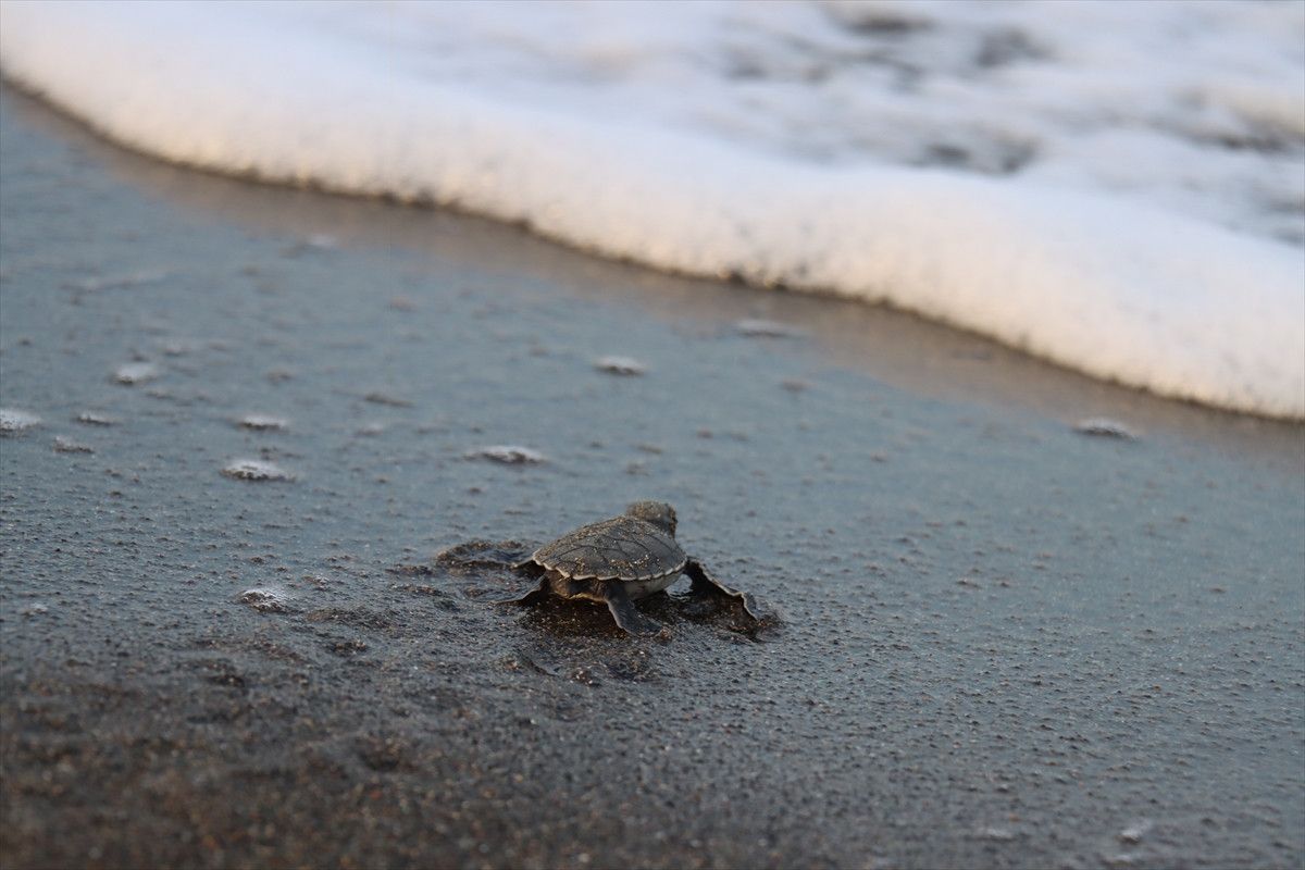 Hatay’ın Samandağ ilçesi kıyısında, yumurtalarından çıkan yeşil deniz kaplumbağası (Chelonia mydas) yavruları denizle buluştu.