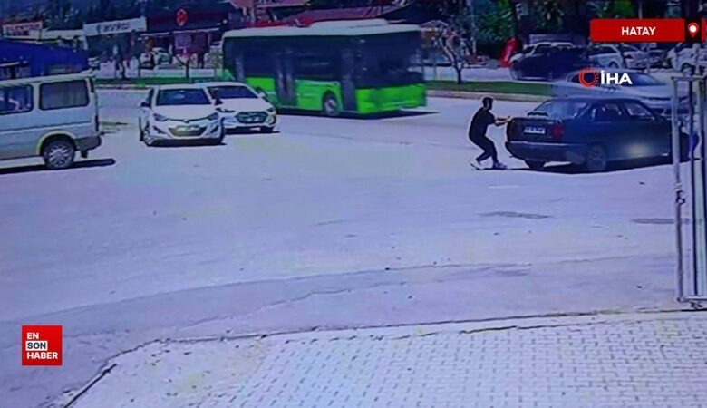 Hatay’da şoförünün el frenini çekmeyi unuttuğu araba, kendi kendine hareket ederek ana yola çıktı ve halk otobüsüyle çarpıştı. Şoförün aracın gerisinden koştuğu anlar güvenlik kamerasına yansıdı. Olayda yaralanan olmadı.