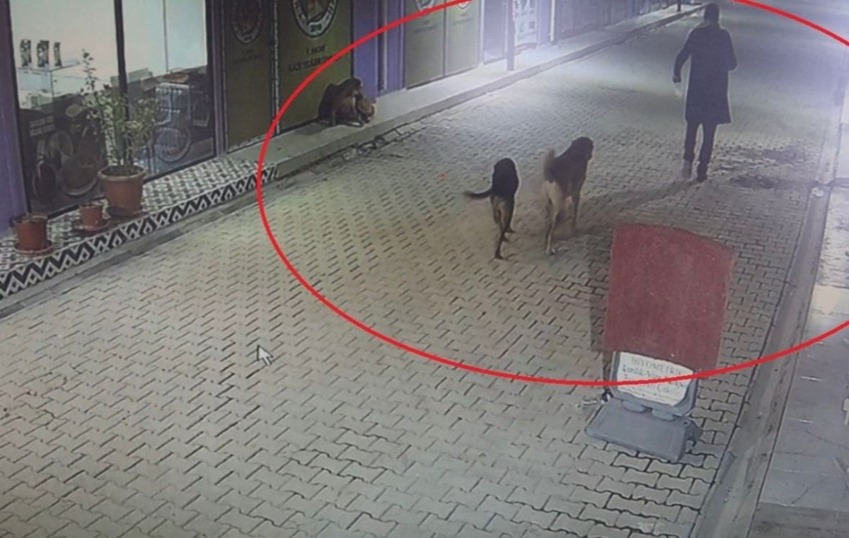 Güvenlik kamerası manzaralarını izleyen esnaf, kimliği bilinmeyen bir kişinin yanında 3 sokak köpeğiyle geldiğini ve iş yerlerinin etrafında dolaştığını gördü.