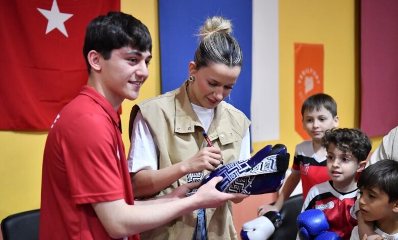 Etkinlik sonunda Hatice Akbaş’a teşekkür plaketi ve çiçek takdim edilirken, genç atletler başarılı boksör ile fotoğraf çektirdi.
