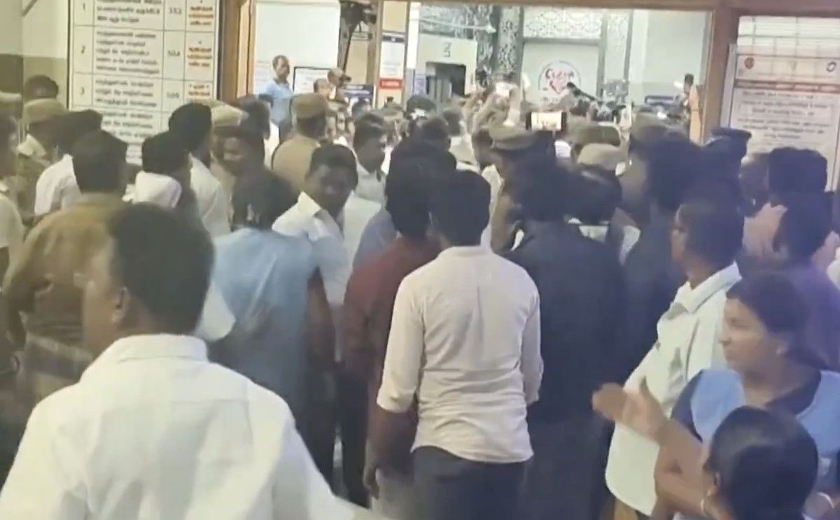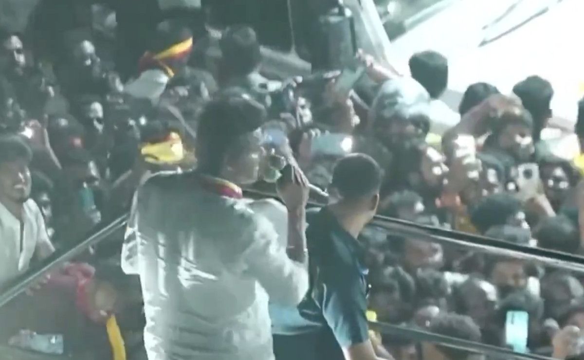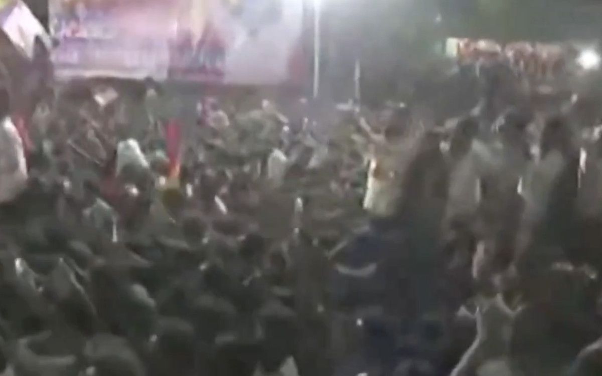 Durumun ciddiyetini fark eden Vijay ise konuşmasını yarıda keserek kalabalığa sakin olmaları davetinde bulundu ve alanı terk etti.