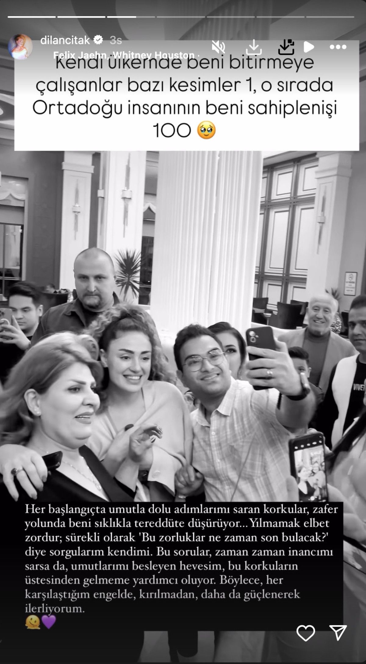Orta Doğu’da daha çok sevildiğini belirten Çıtak, hayranlarıyla bir ortada olduğu görüntüyü yayınlayarak “Kendi ülkemde beni bitirmeye çalışan birtakım bölümler 1, o sırada Orta Doğu beşerinin beni sahiplenişi 100.” dedi.