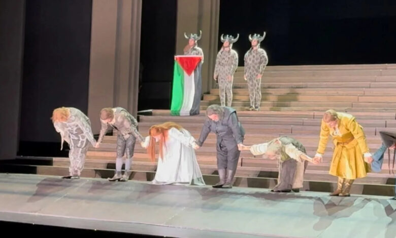 Kraliyet Opera Salonu’nda 11 gece oynayan Vilayet Trovatore operasının final gecesinde sanatkarlardan biri, şov sonunda Filistin bayrağı açtı.