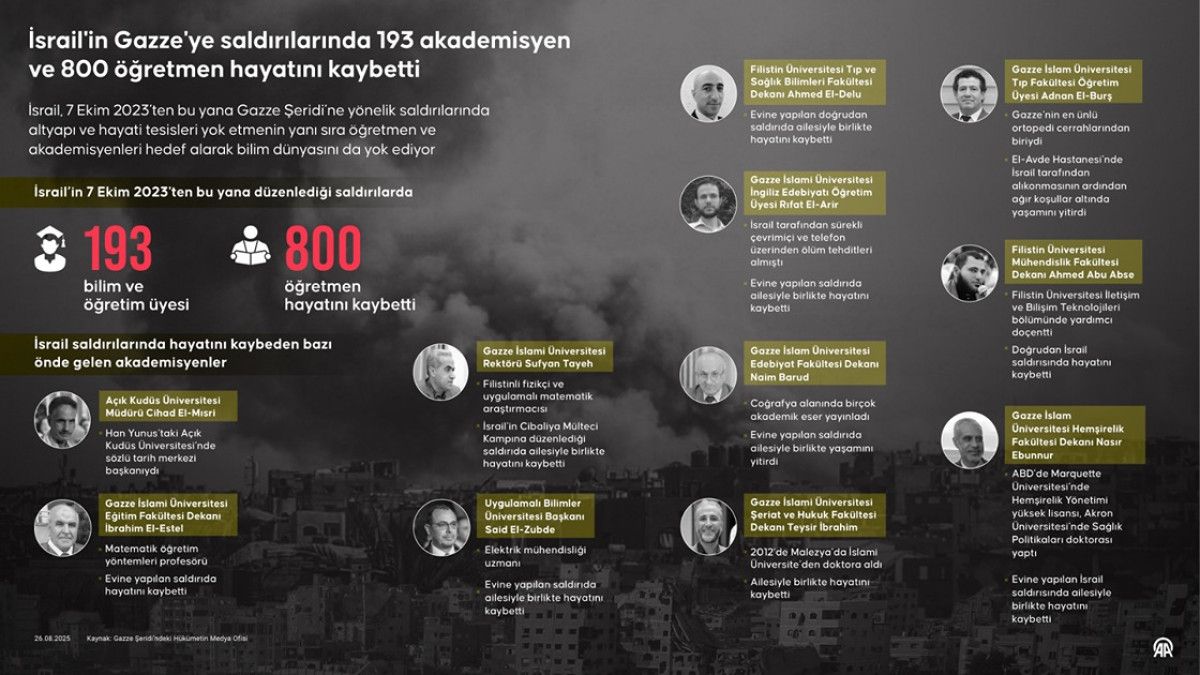 İsrail, 7 Ekim 2023’ten bu yana Gazze Şeridi’ne yönelik akınlarında altyapı ve hayati tesisleri yok etmenin yanı sıra öğretmen ve akademisyenleri hedef alarak bilim dünyasını da yok ediyor.