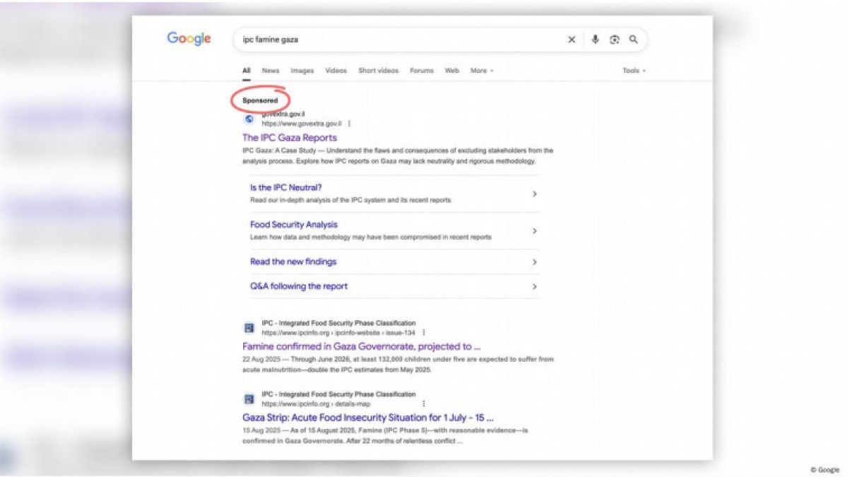 (Google’daki arama sonucunda IPC’nin Gazze kıtlık raporunu itibarsızlaştıran sponsorlu bir içeriği iilk sırada görünüyor)