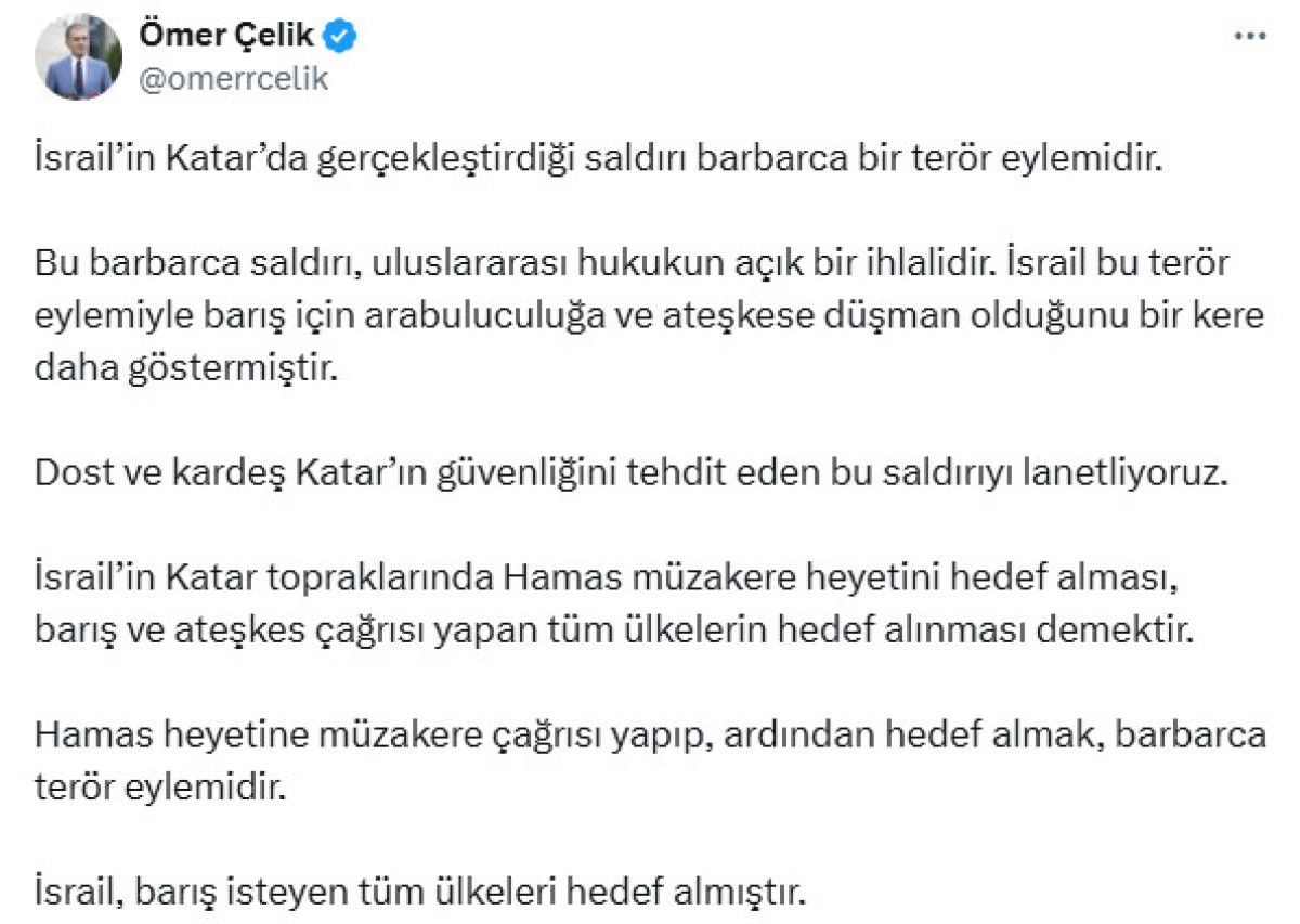 İsrail’in Katar’da gerçekleştirdiği taarruz barbarca bir terör aksiyonudur.