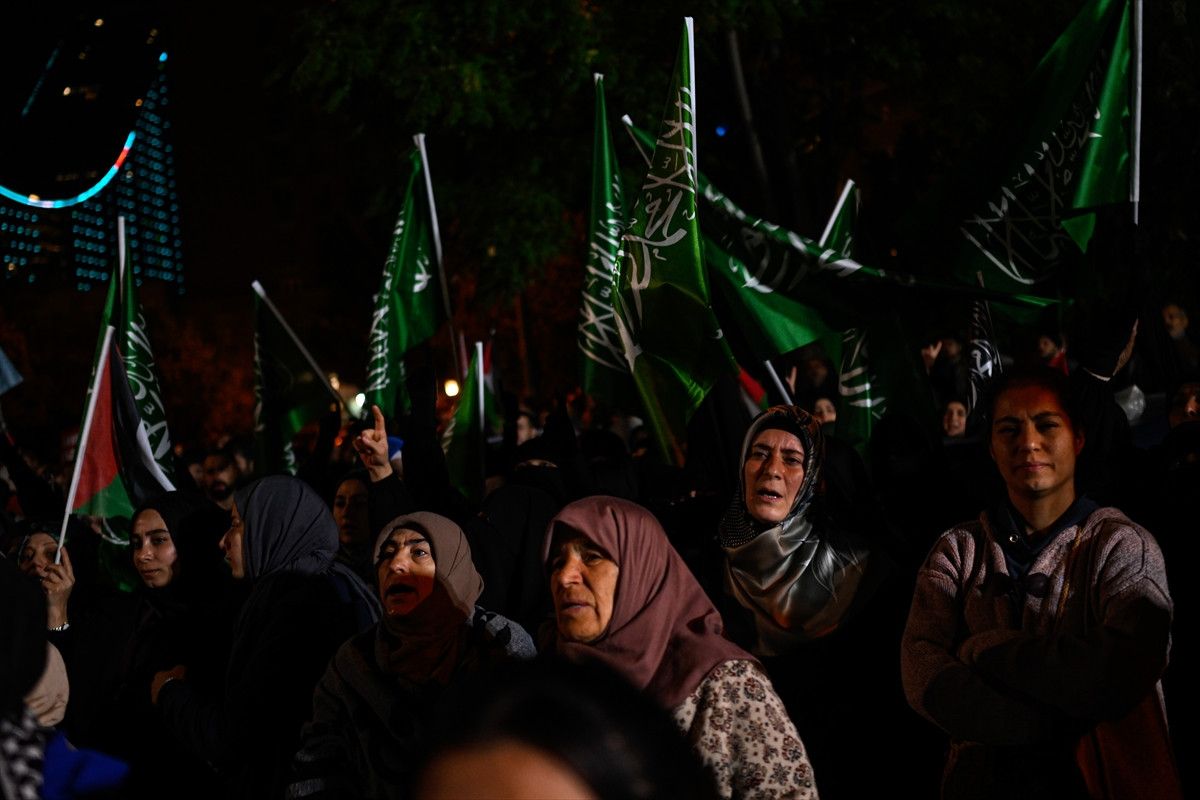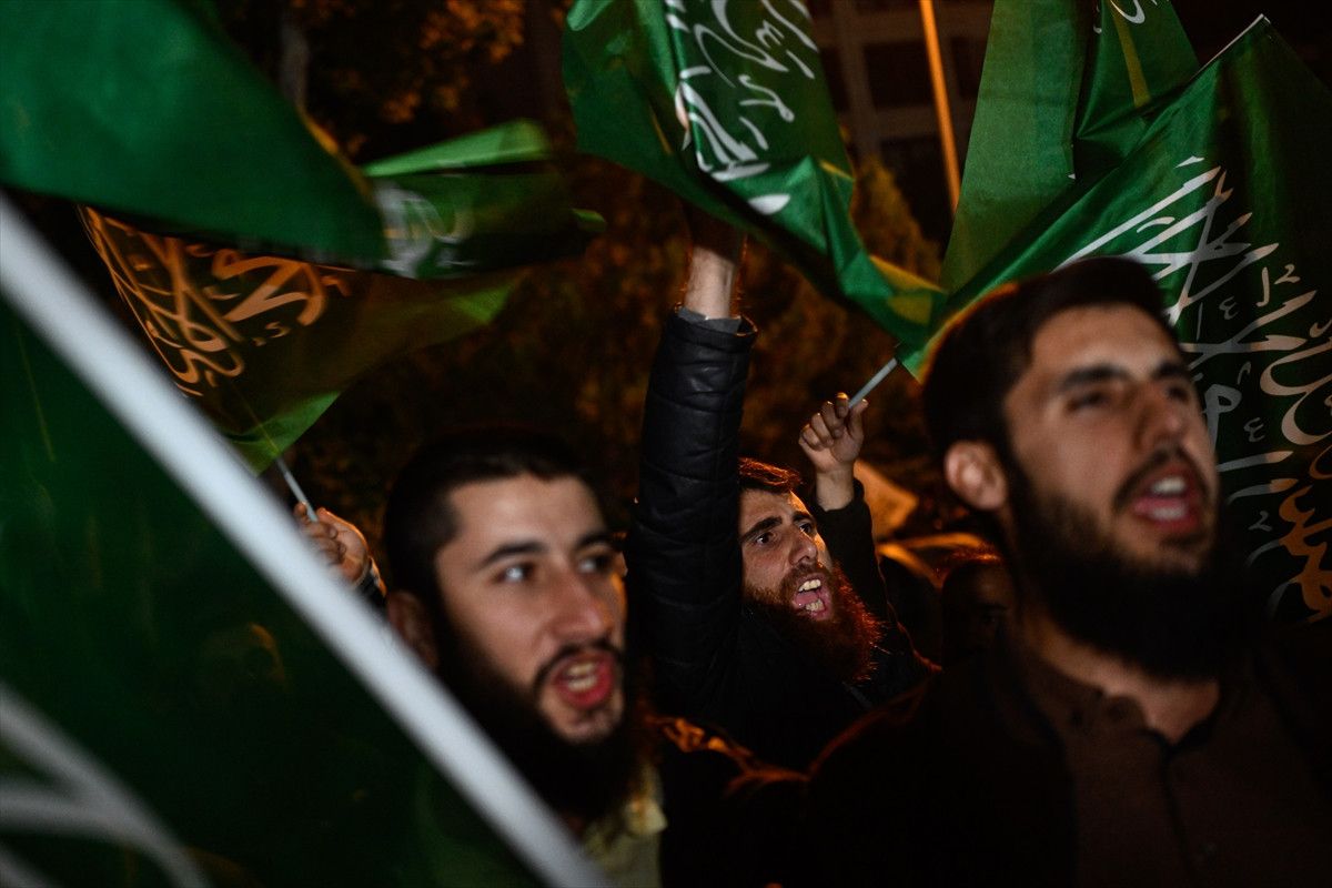 Filistin bayrakları ve pankartlarla şova katılanlar, taarruza reaksiyon göstererek İsrail tersi sloganlar attı.