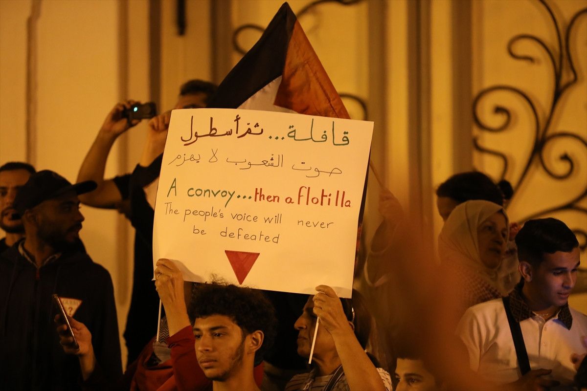 Göstericiler, “Denizin derinliklerinden özgürlük sabahı doğacak” ve “Küresel Sumud Filosu özgür halkların abluka altındaki Gazze’ye mesajı'” yazılı dövizler taşıdı.