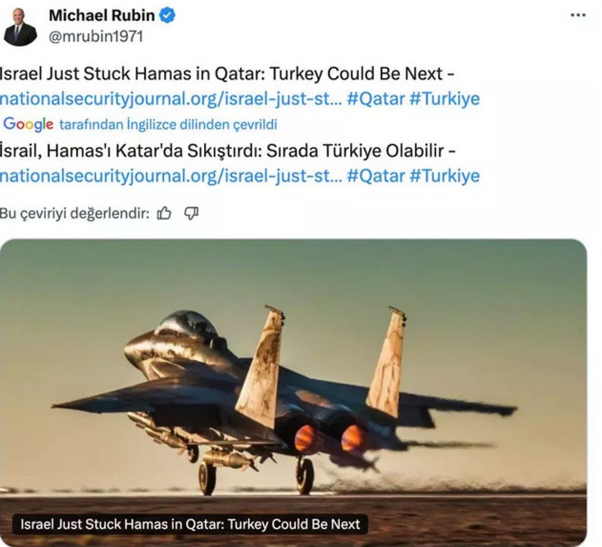 İsrail’in sözcülerinden ABD’li Michael Rubin ise toplumsal medya hesabından paylaştığı yazıda İsrail’in Hamas’ı Katar’da sıkıştırdığını ve sıradaki maksadın Türkiye olabileceğini belirtti.
