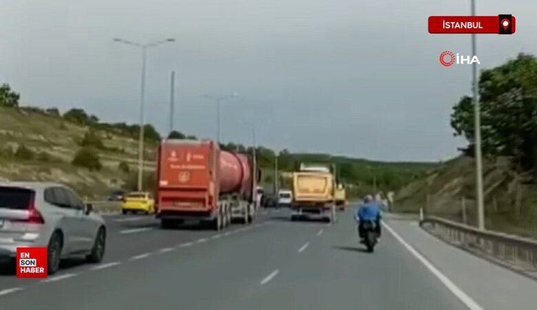 İstanbul Havalimanı yolunda bir motosiklet şoförünün tehlikeli hareketleri yürekleri ağza getirdi. Motosiklet şoförünün makas attığı, ön tekiri kaldırdığı ve emniyet şeridini kullanarak ilerlediği anlar cep telefonu kamerasıyla görüntülendi.