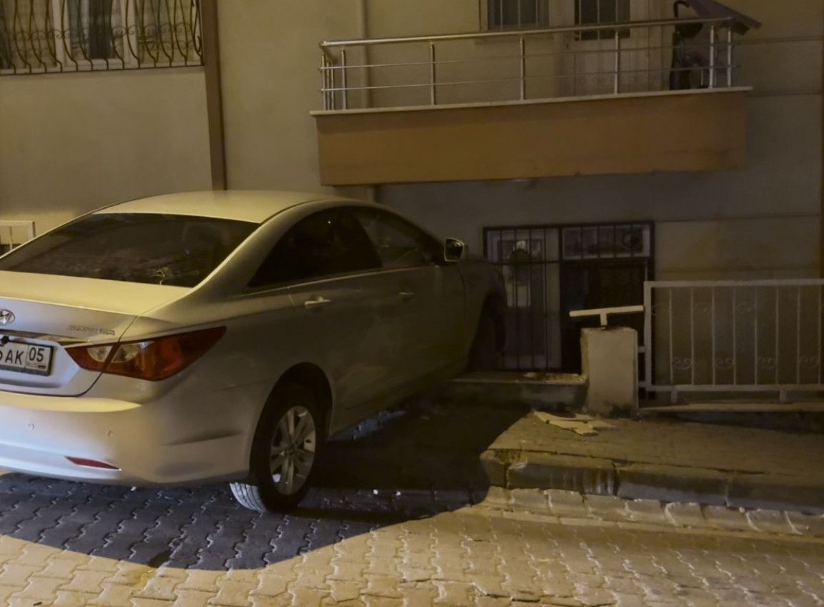 Kontrolden çıkan araç, süratle bahçe muhafaza demirlerini yıktıktan sonra apartman girişine çarptı.