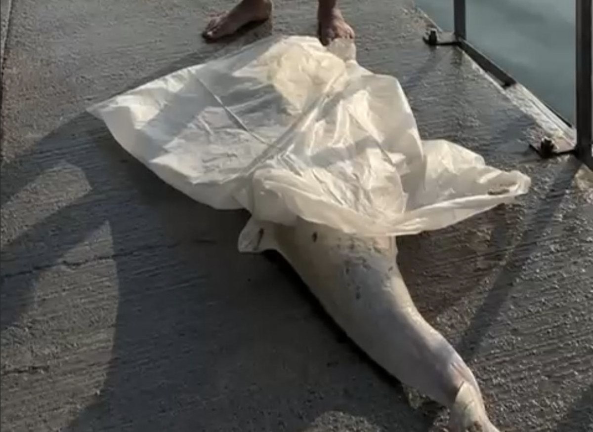 Çevredekilerin yardımıyla denizden çıkarılan yunus, poşete konularak çöp konteynerine atıldı.