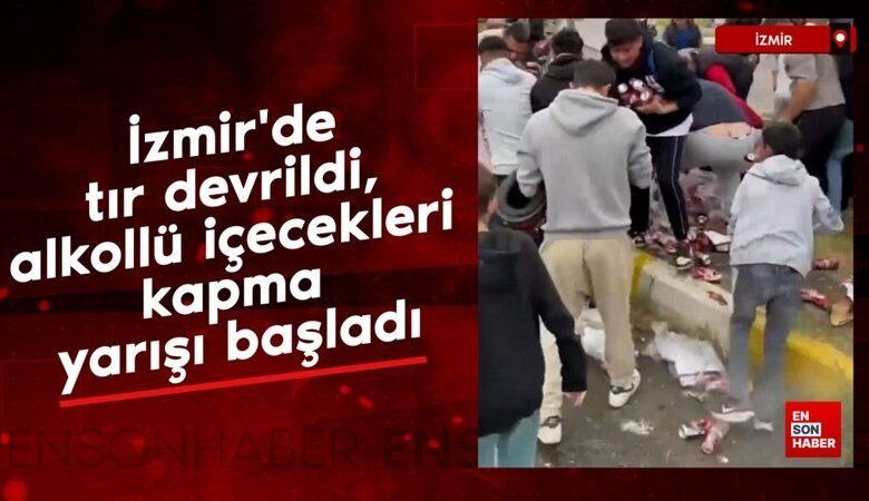 İzmir’de tır devrildi, alkollü içecekleri kapma yarışı başladı