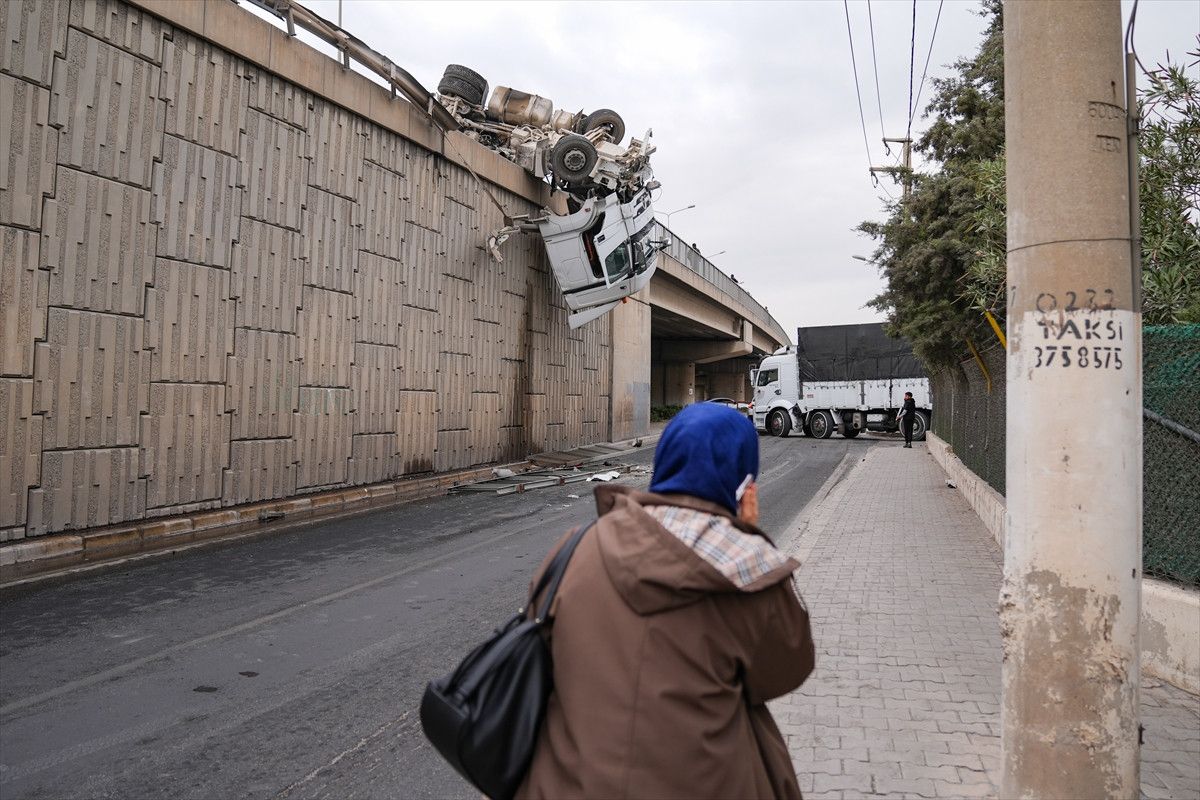 Kazaya ait ortaya çıkan güvenlik kamerası görüntülerinde kontrolden çıkan tırın, viyadükte asılı kaldığı anlar yer aldı.