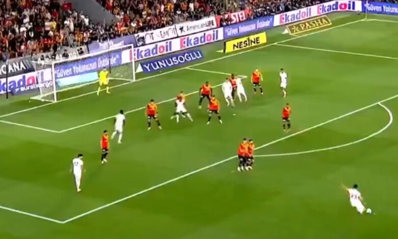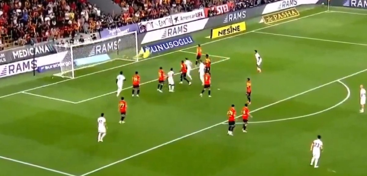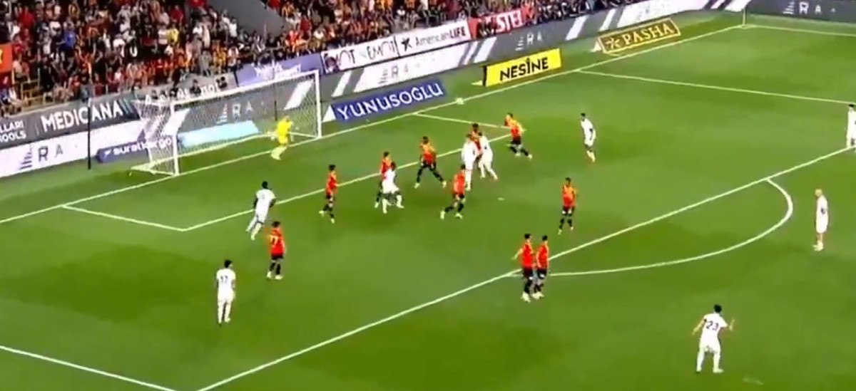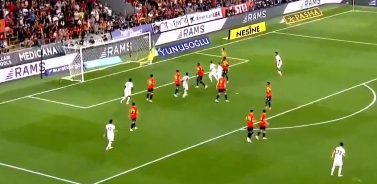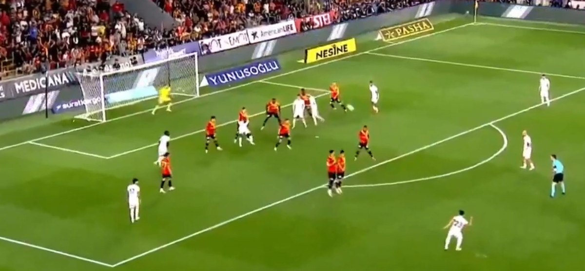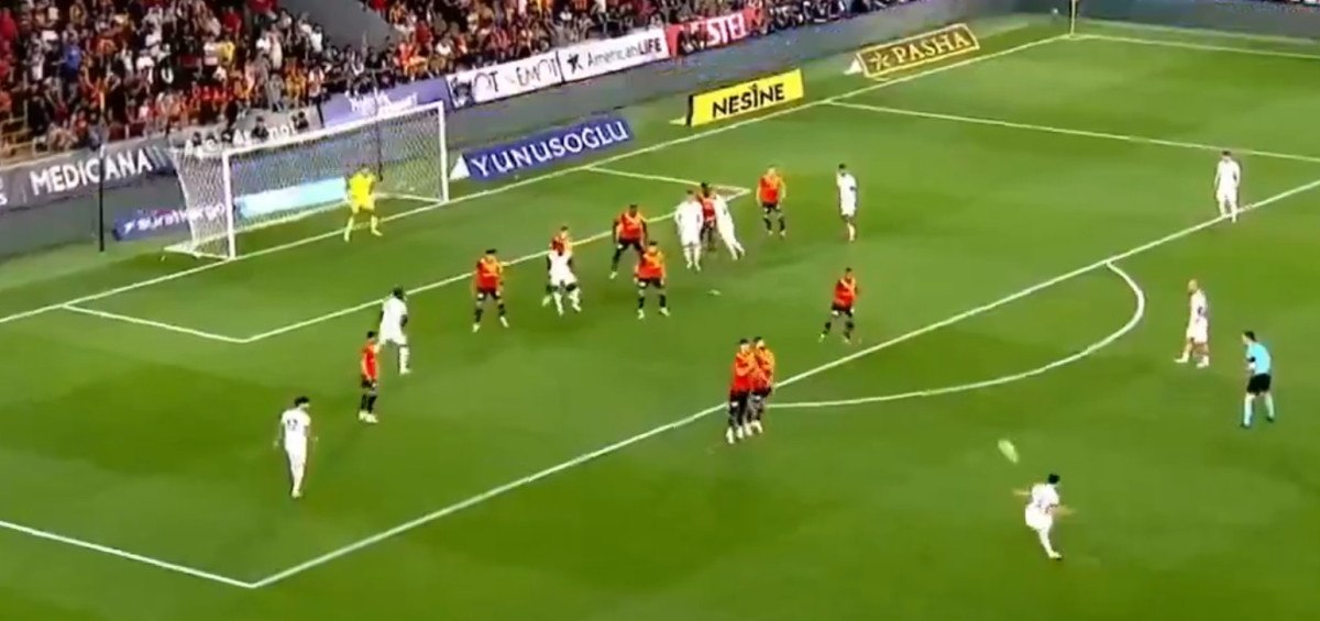 Sol iç kulvardan uzak aradan kullanılan özgür vuruşta Kaan Ayhan sağ ayağıyla vuruşunu yaptı, meşin yuvarlak uzak köşeden doksana gitti.