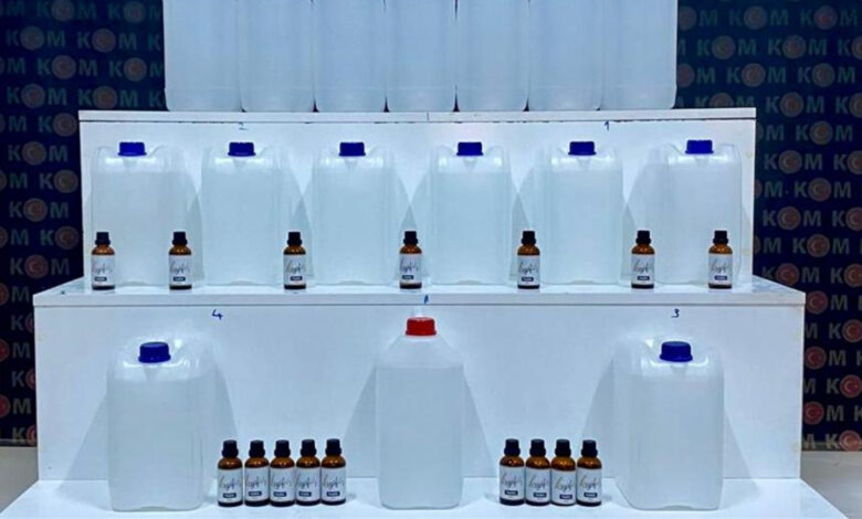 Şüphelilerin konut ve iş yerlerinde yapılan aramalarda, 22,5 litre geçersiz içki, 160 litre etil alkol, 28 şişe aroma kiti ve 7 şişe gümrük kaçağı içki ele geçirildi.