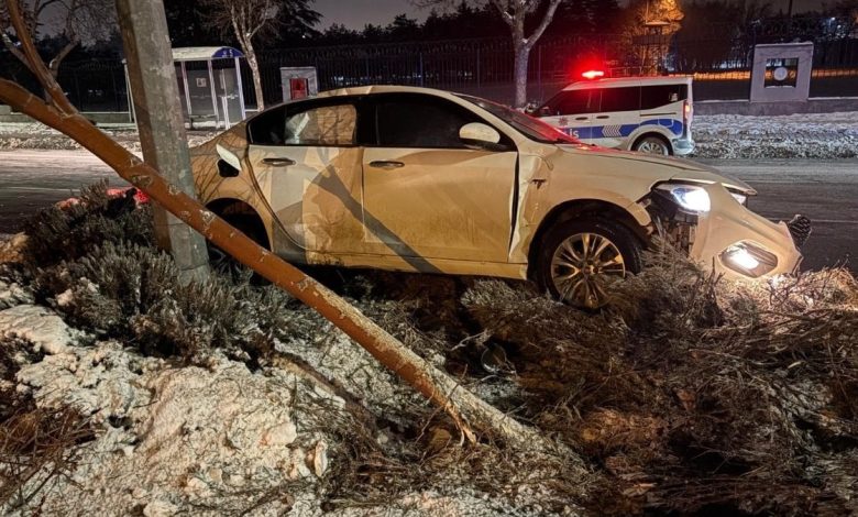 Kayseri’nin Melikgazi ilçesine bağlı Esenyurt Mahallesi Mehmet Özhaseki Bulvarı üzerinde H.K. idaresindeki araba, şoförünün direksiyon hakimiyetini kaybetmesi sonucu evvel refüjdeki ağacı devirdi, sonra da aydınlatma direğine çarparak durabildi.
