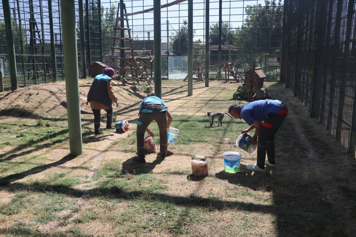 Anadolu Mükemmeller Diyarı’ndaki hayvanat bahçesinde sıcaktan bunalan maymunlara, sıcaklığın en yüksek olduğu öğlen saatlerinde bakıcıları tarafından hazırlanan buzlu meyve kokteyli veriliyor.