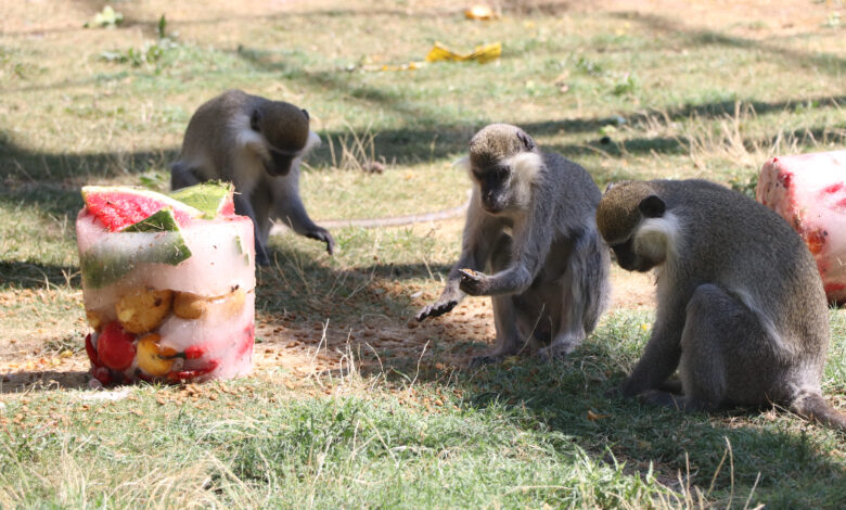 Karpuz, armut, çilek, elma ve kayısı yıkandıktan sonra küçük dilimler halinde kaplara konuluyor, su da eklenerek buzlukta dondurulan meyveler maymunlara veriliyor.