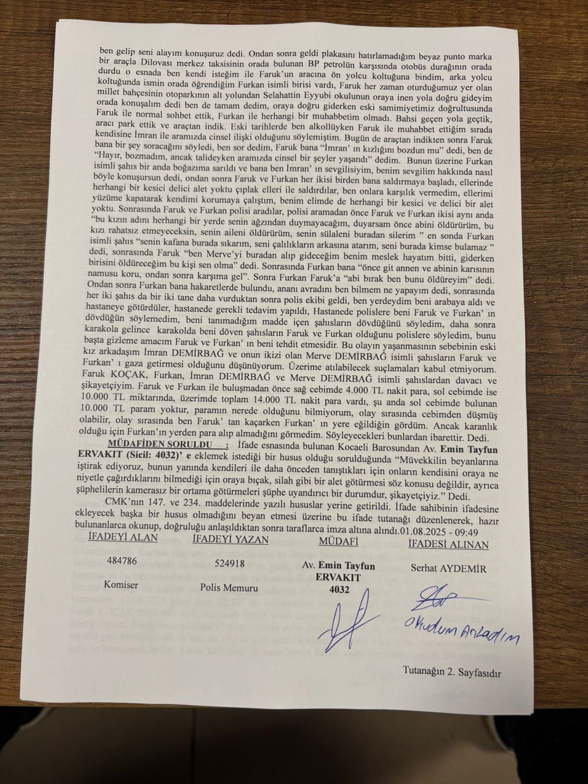 İfadesinin devamında, birkaç ay evvel sözlüsünden ayrıldığını ve o tarihten bu yana İ.D. ile hiçbir formda görüşmediğini belirten Serhat Aydemir, gece geç saatlerde F.K.’nin kendisini arayarak görüşmek istediğini söyledikten sonra F.K.’nin kullandığı araba ve içerisinde öteki bir polis memuruyla olay yerine geldiklerini tez etti.