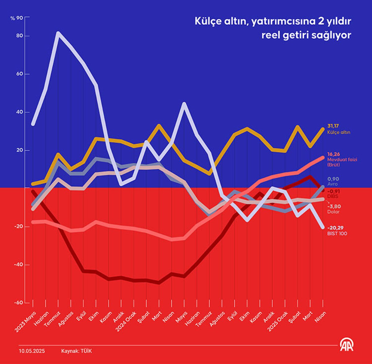 Tüm bu global gelişmelerle birlikte TÜİK tarafından gerçek getirileri incelenen finansal yatırım araçları ortasında da külçe altının öbür yatırım araçlarından ayrışması dikkati çekti.