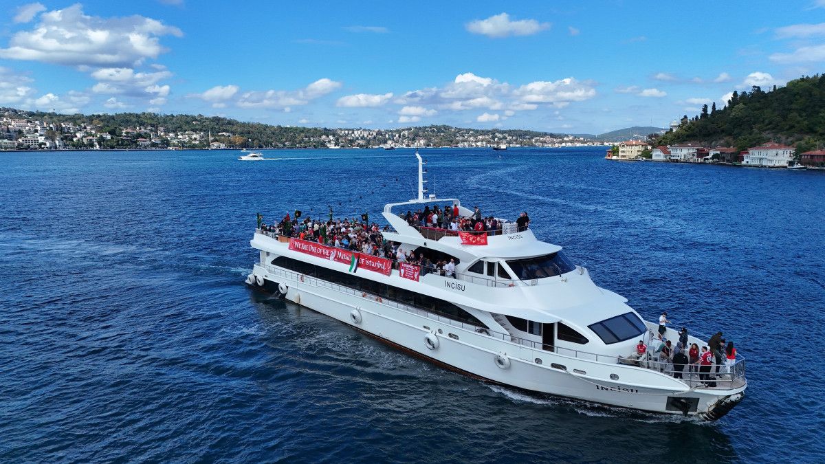 Öte yandan İngiliz taraftarlarını taşıyan teknede Filistin bayrağının olması da dikkat çekti.