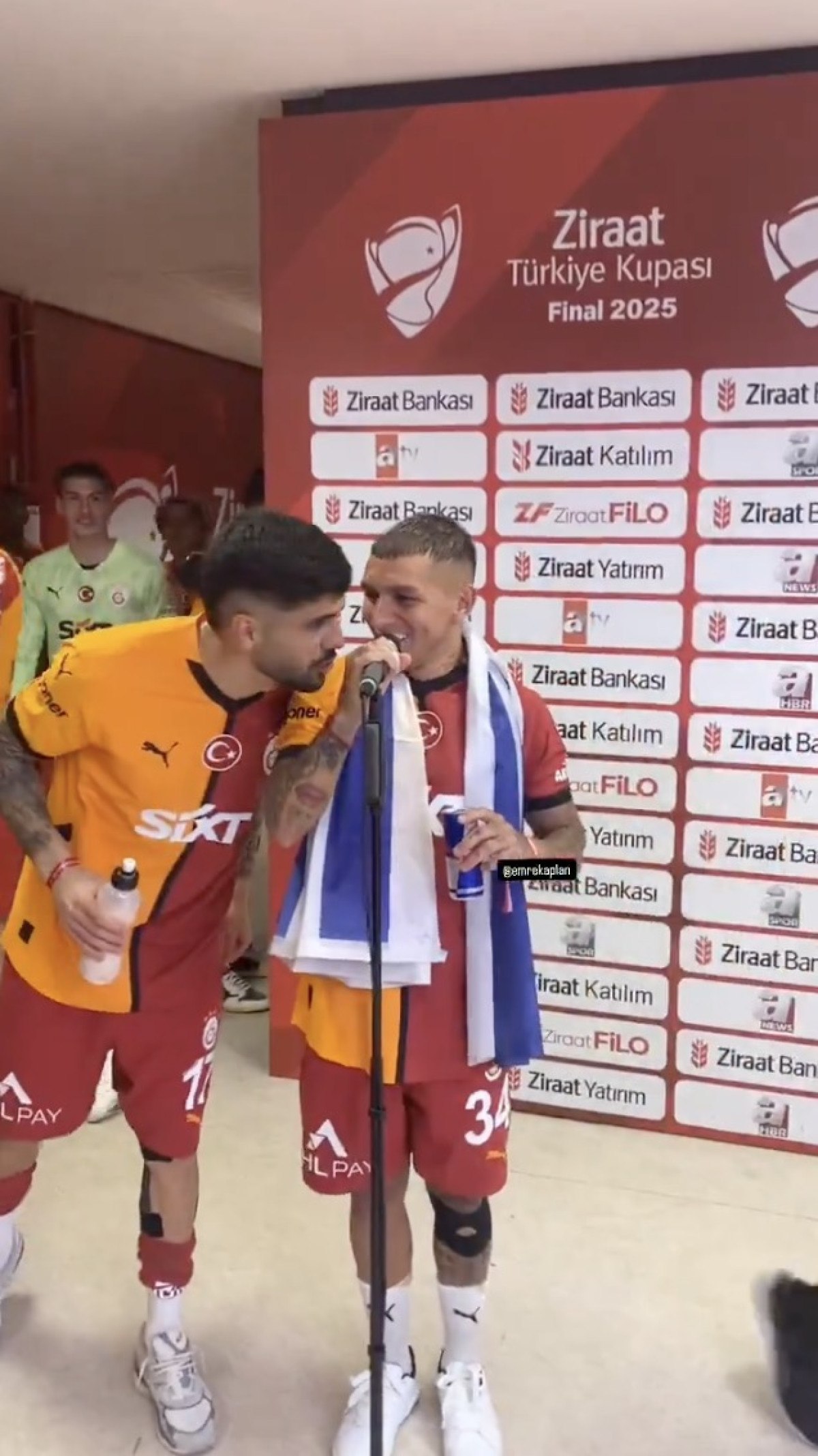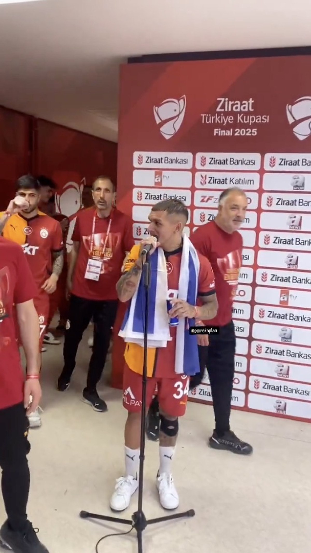 Kupa şampiyonluğu sonrası soyunma odasına giderken koridorda mikrofonun başına geçen Lucas Torreira, Türkçe olarak ‘Okan Buruk istifa’ sözleri ile latife yaptı.