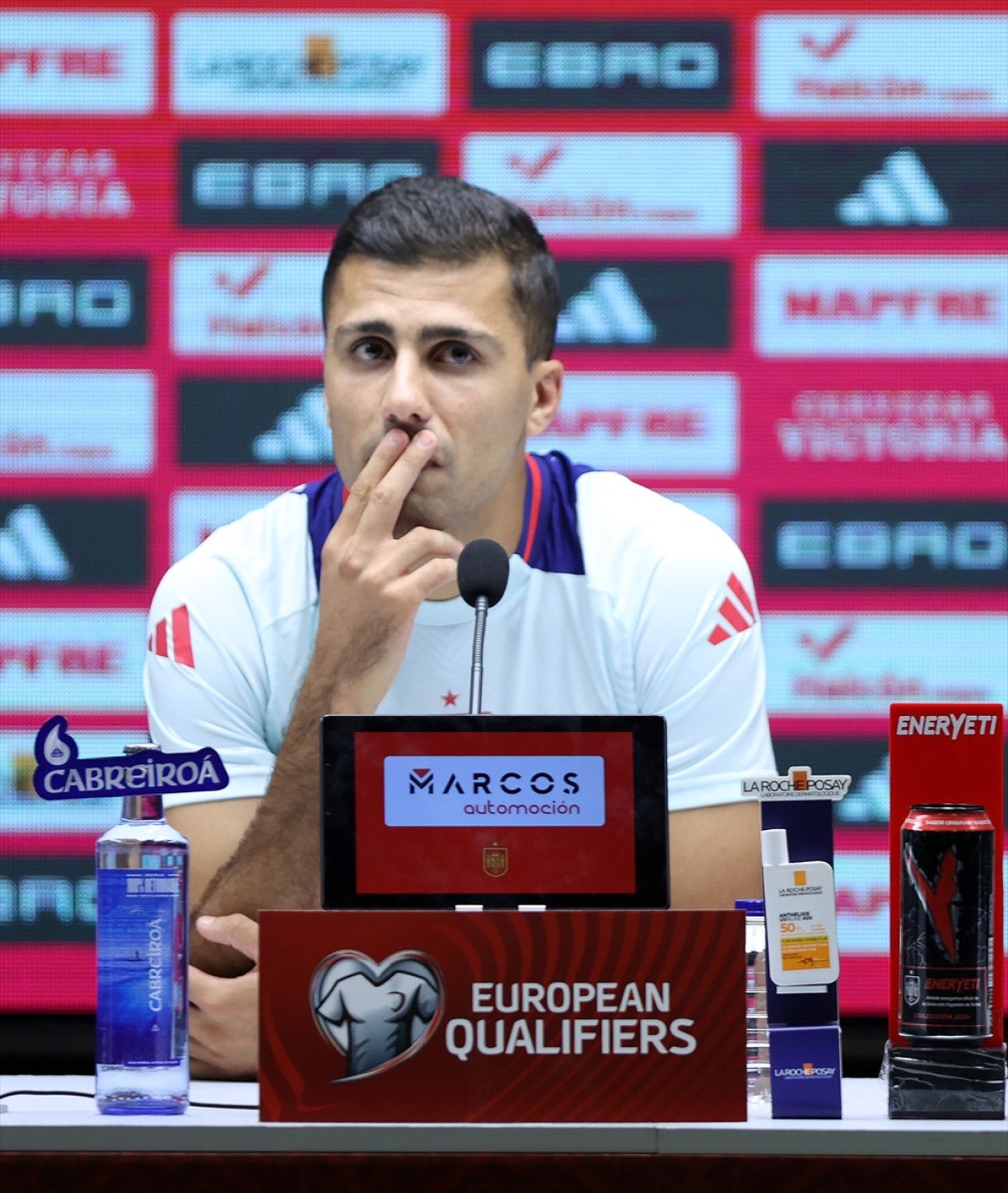 “İspanya ulusal grubunda galibiyet serisi rekorunu kırmaya çok yakınsınız. Neler söylersin?” sorusuna Rodri, “Evet, buna çok yakınız. Bu istatistikleri takip ediyoruz. Çok yüksek kapasiteye sahibiz, kıymetli bir seri yakaladık. Bu neslin daha fazlasını yapabileceğini de biliyoruz. Katiyen ayaklarımız yere sağlam basmalı, mütevazi olmalıyız. Önümüzde çok sıkıntı maçlar var, bilhassa yarınki maç bizim için amaç maç. Buna nazaran davranmalıyız” karşılığını verdi.