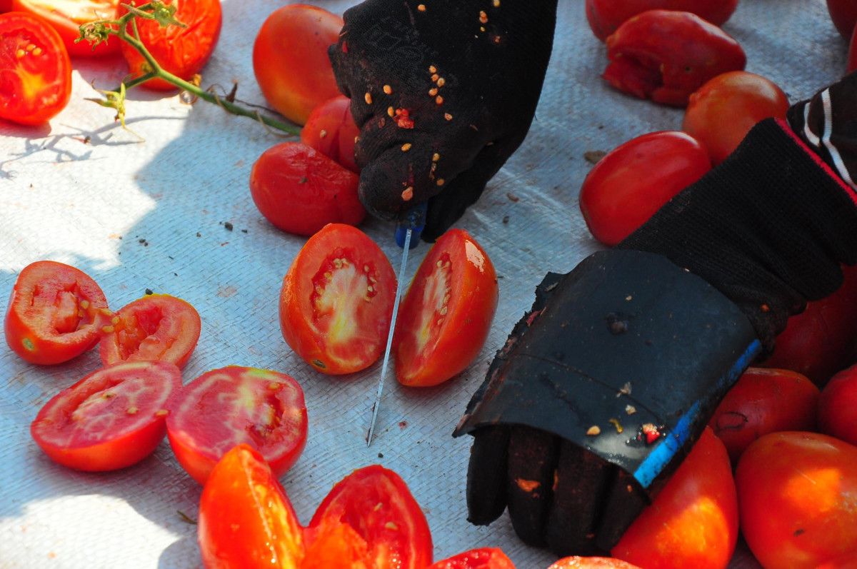 Kadın personeller tarafından taze bir biçimde toplanarak kasalara doldurulan domatesler, getirildiği stant alanlarında kesilerek, kurutulmaya bırakılıyor.