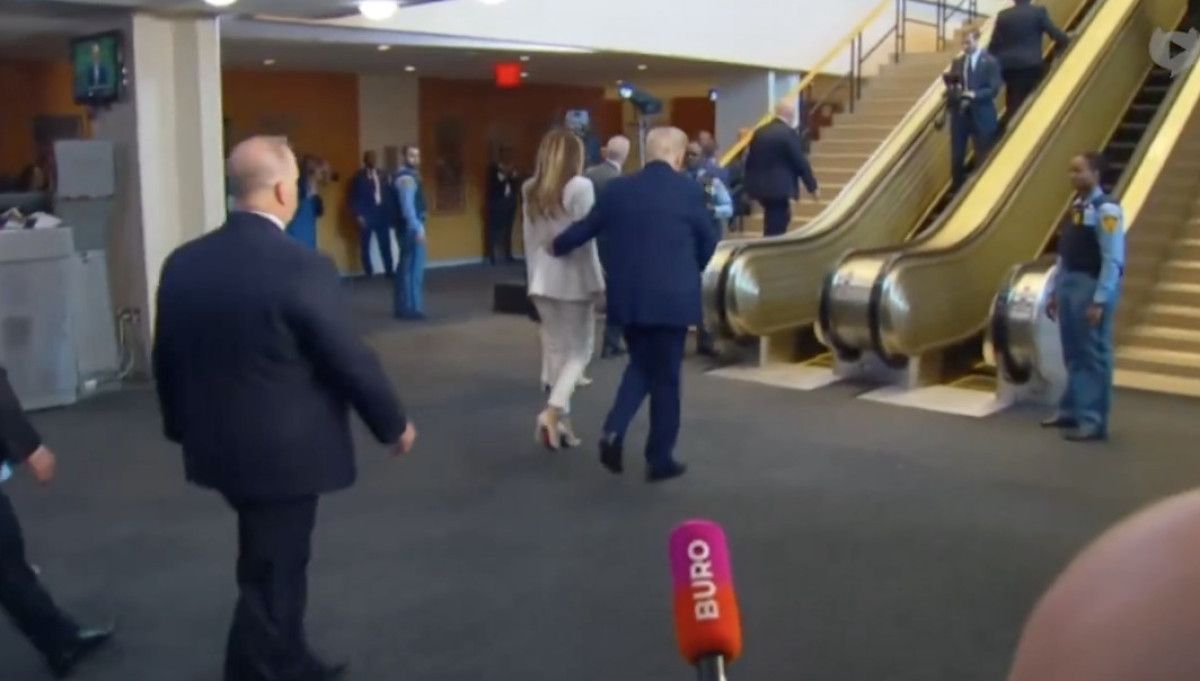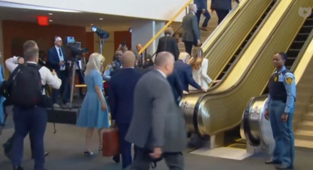 İlk olarak önde olan Melania akabinde da Donald Trump, hareketsiz olan yürüyen merdivenden üst çıktı.