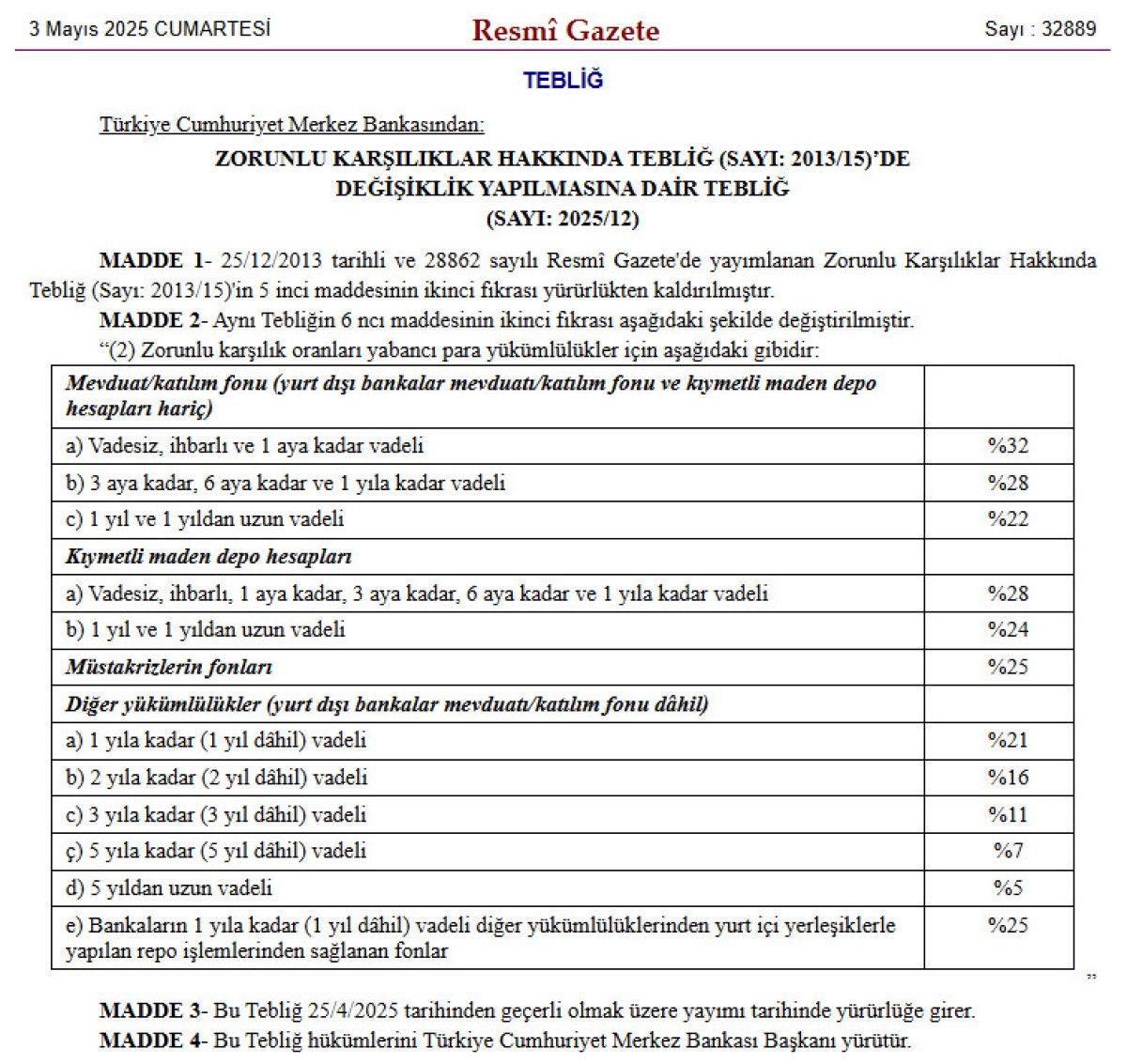 – Yurt içi yerleşiklerle yapılan, 1 yıla kadar vadeli yabancı para cinsi repo süreçlerinde sağlanan fonlar için zarurî karşılık oranı 400 baz puan artırıldı, ayrıyeten hesaplama metodu değiştirildi.