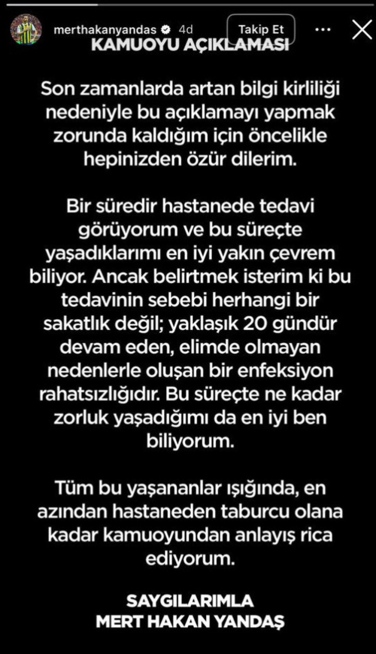 Son vakitlerde artan bilgi kirliliği nedeniyle bu açıklamayı yapmak zorunda kaldığını aktaran Mert Hakan, “Bir müddettir hastanede tedavi görüyorum ve bu süreçte yaşadıklarımı en güzel yakın etrafım biliyor. Lakin belirtmek isterim ki bu tedavinin sebebi rastgele bir sakatlık değil. Yaklaşık 20 gündür devam eden, elimde olmayan nedenle oluşan bir enfeksiyon rahatsızlığıdır. Bu süreçte ne kadar zorluk yaşadığımı da en güzel ben biliyorum.” sözlerini kullandı.