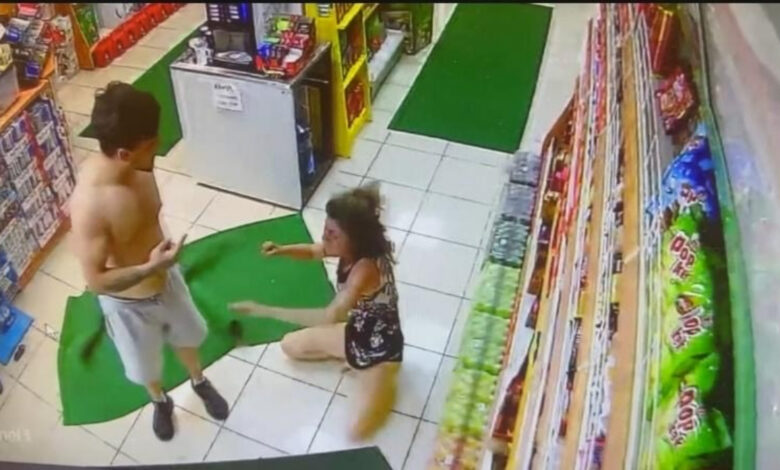 Akaryakıt istasyonunda pompaların bulunduğu kısımda şiddete uğrayan bayan, market kısmına sığınmaya çalıştı.