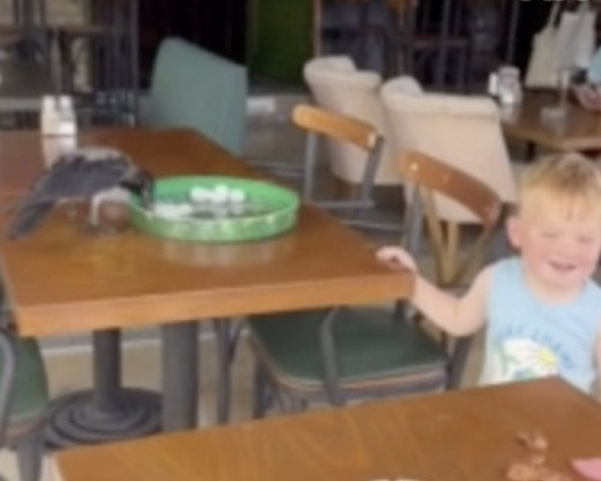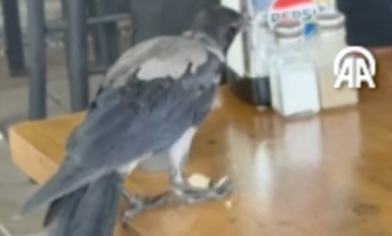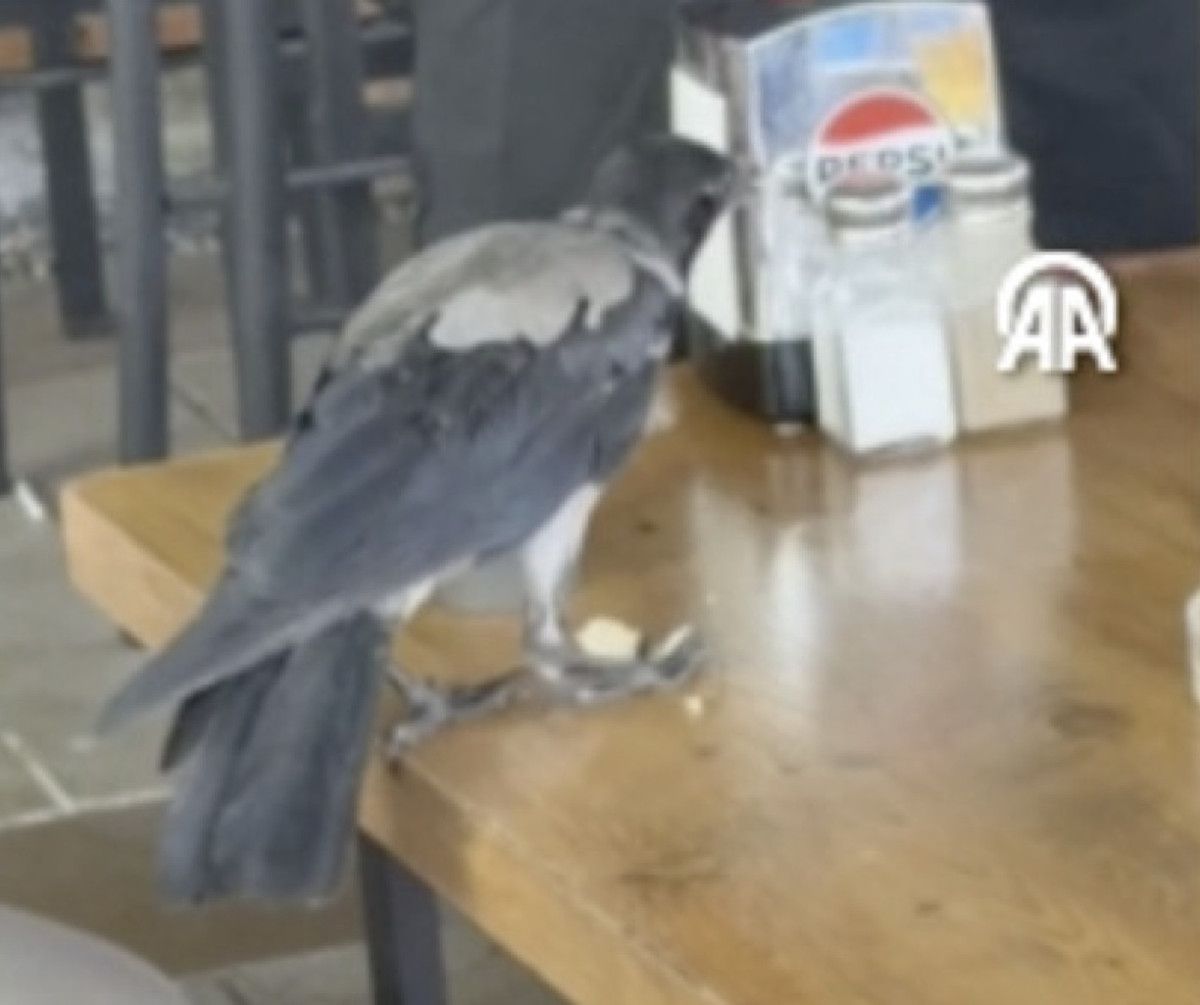 Muğla’nın Bodrum ilçesinde sıcaktan etkilenen karga, girdiği kafede masaya bırakılan suyu içti ve verilen yiyecekleri yedi.