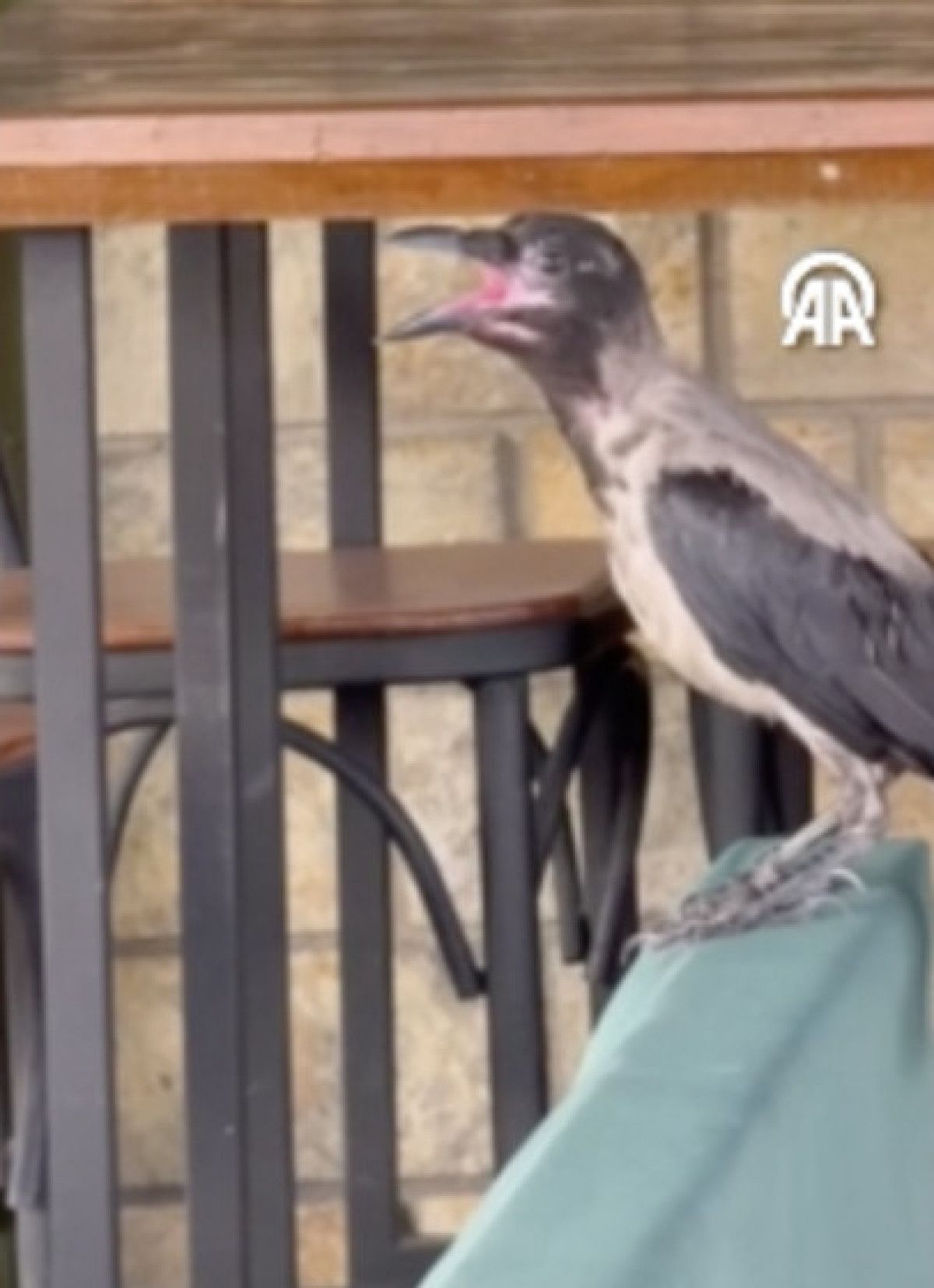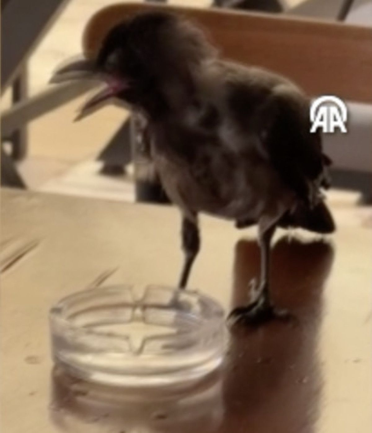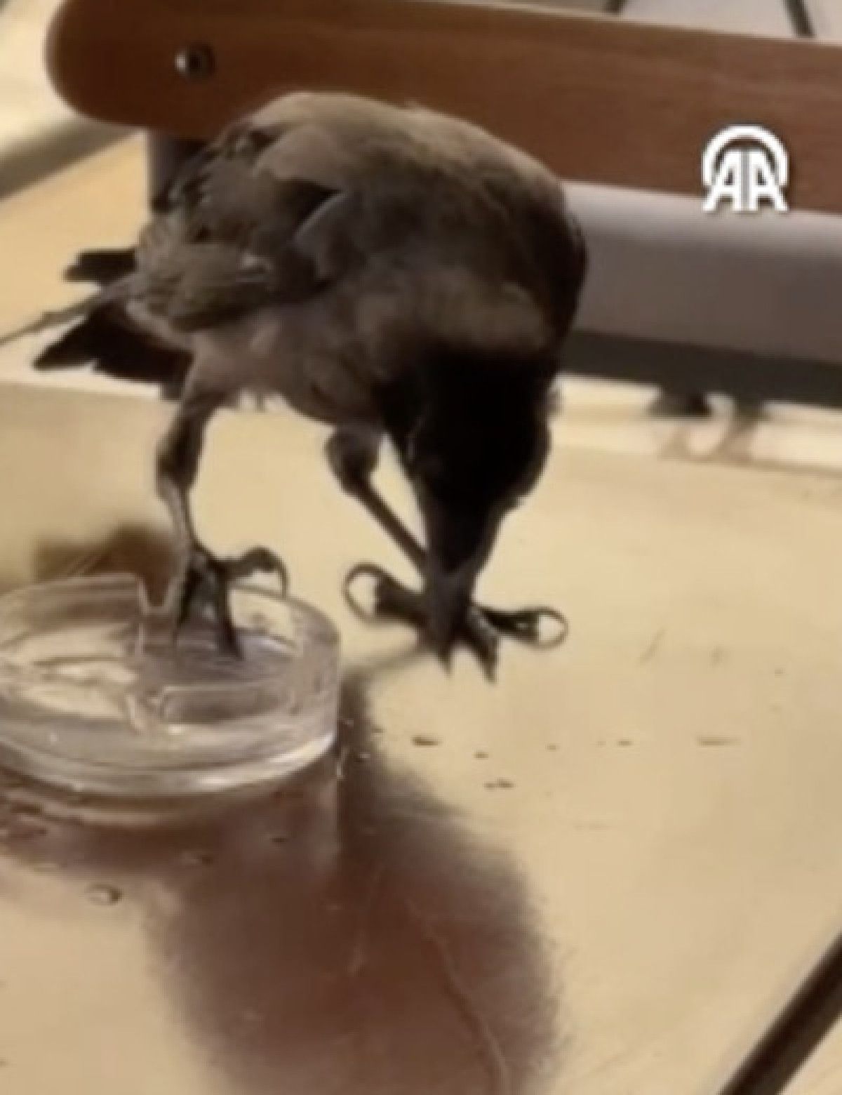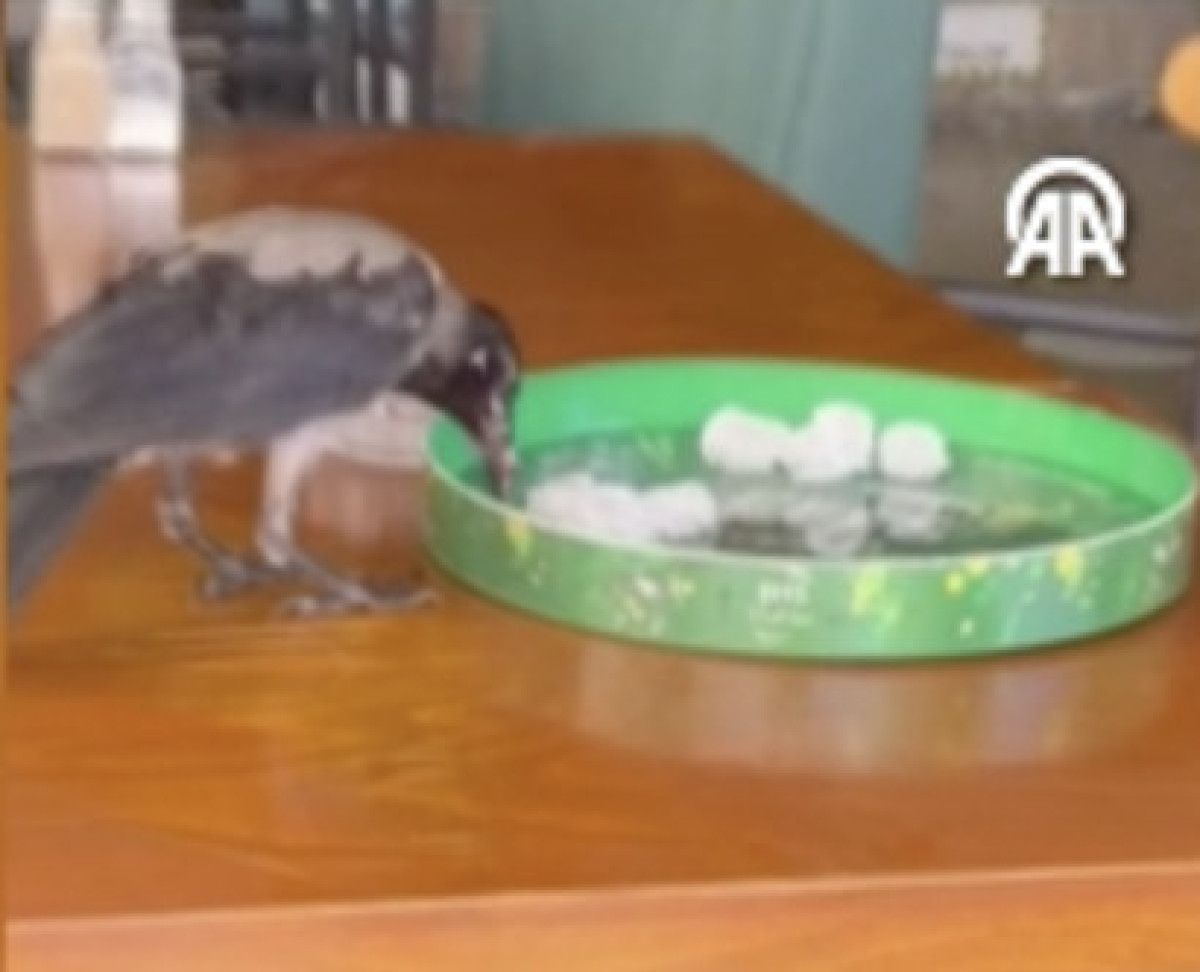 Görüntülerde, karganın ağzı açık halde sandalyeye konduğu ve işletme sahibince verilen suyu içmesi yer alıyor.