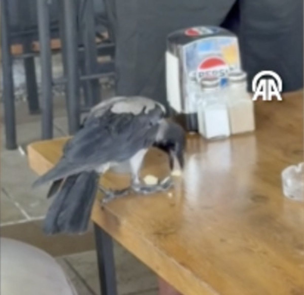 Bir tepsideki buzlu sudan da içen karganın kafedekilerin verdiği yiyeceklerden de yediği, daha sonra uçarak bölgeden uzaklaştığı görülüyor.