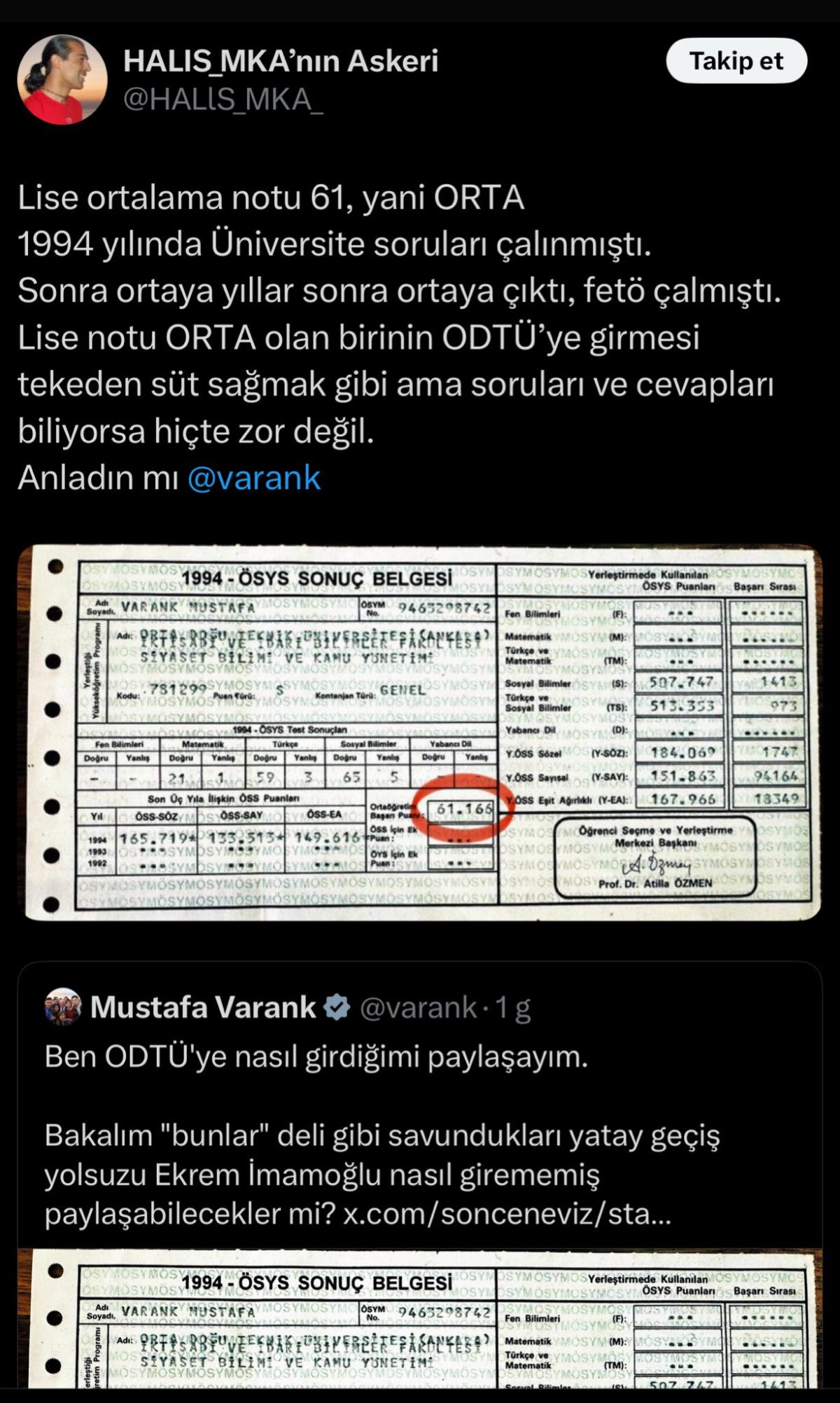 1994 yılında soruların çalındığını belirten toplumsal medya kullanıcısı, lise ortalama notunun 61 ve orta olduğunu, bu puanla ODTÜ’ye girmenin sıkıntı olduğunu savundu.
