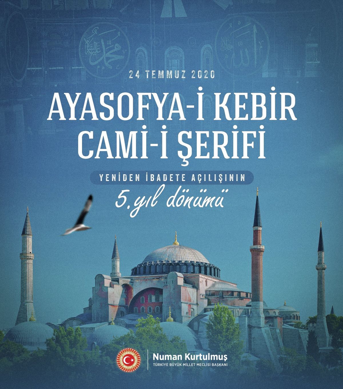 Son olarak TBMM Başkanı Numan Kurtulmuş, Ayasofya-i Kebir Cami-i Şerifi’nin ibadete açılışının 5’inci yıl dönümü hasebiyle paylaşımda bulundu.