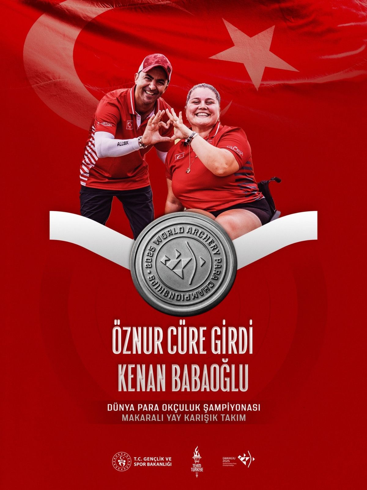 Öznur Cüre Girdi ile Kenan Babaoğlu’ndan oluşan Makaralı Yay Karışık Ulusal Grubu, gümüş madalya aldı.