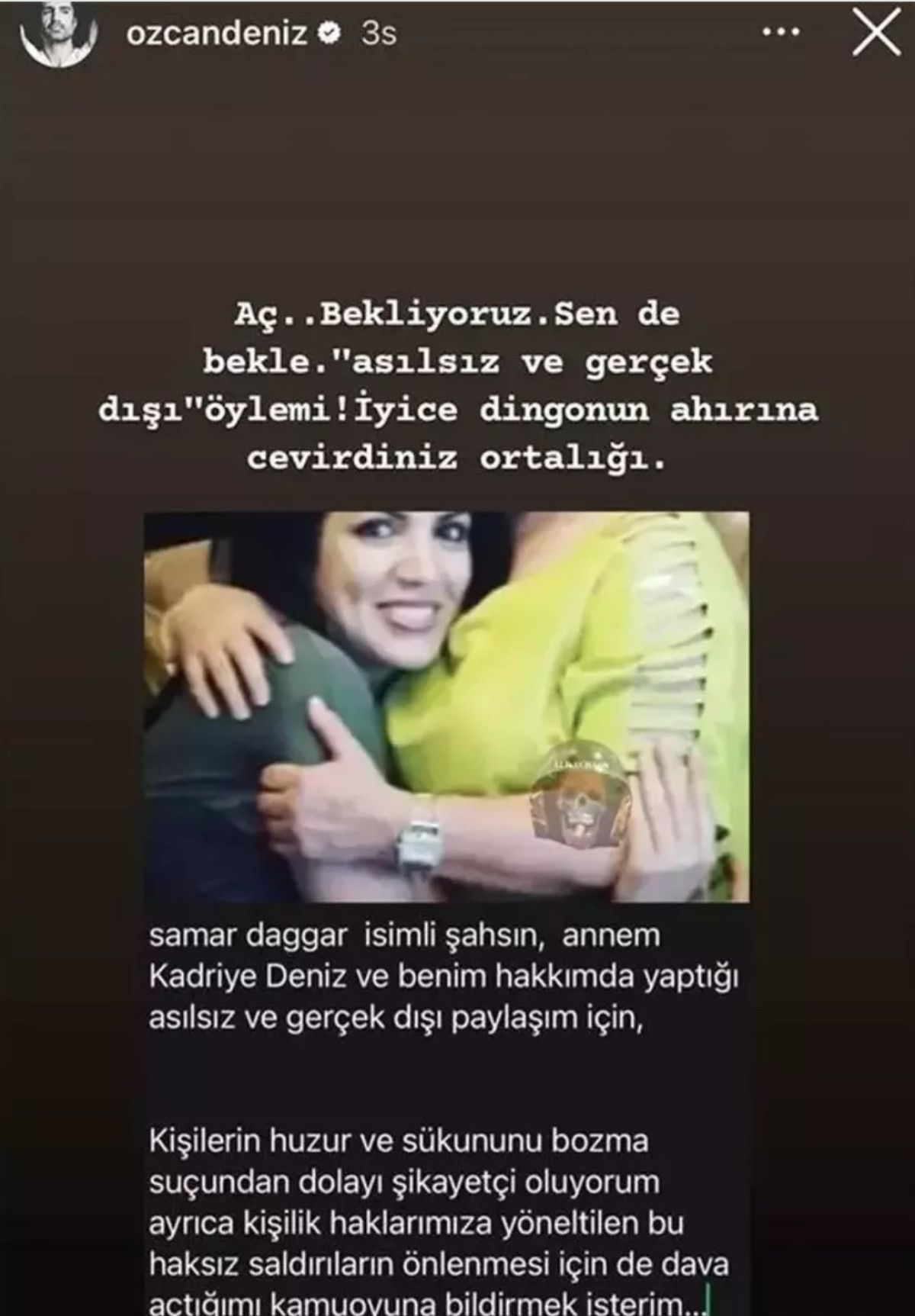 ”Samar Dadgar isimli şahsın, annem Kadriye Deniz ve benim hakkımda yaptığı temelsiz ve gerçek dışı paylaşım için, bireylerin huzur ve sükununu bozma hatasından ötürü şikayetçi oluyorum ayrıyeten kişilik haklarımıza yöneltilen bu haksız hücumların önlenmesi için de dava açtığımı kamuoyuna bildirmek isterim…”